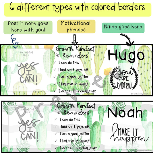Growth Mindset Editable Desk Plates | Desk Name Tags [Cactus Theme]