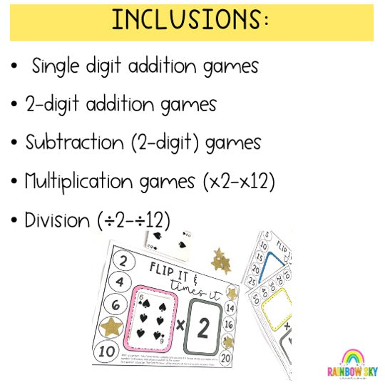 This resource is designed to provide your students with hands-on games to assist in building their number and operation fluency skills. As your students use this resource, they will also begin to notice patterns which will in turn assist with fluency.