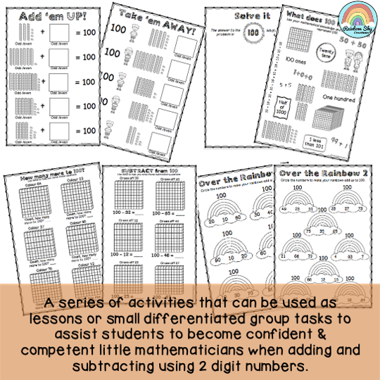 This highly engaging, time saving pack includes 18 activities to teach your students how to add and subtract 2-digit numbers. Activities can be used as lessons, small group tasks or lesson starters to assist your students to become confident and competent little mathematicians.