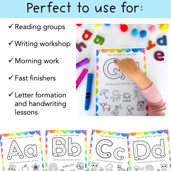 These alphabet cards are perfect to help students work on their letter formation and identifying initial sounds in words. Use as an easy reading group activity, literacy centre, writers workshop or for fast finishers.