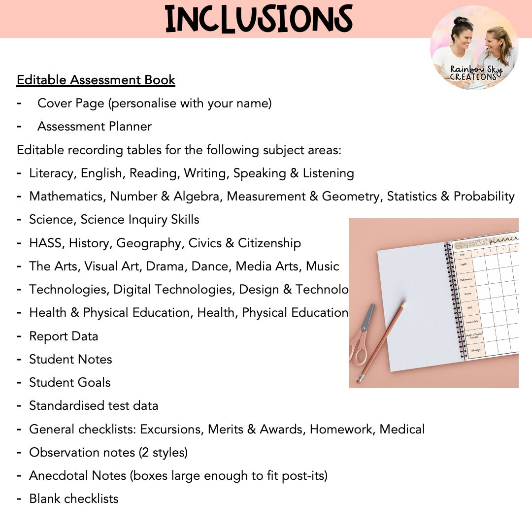 Bind your Assessment Book or put it in a folder and continue to add extra pages as the year continues (guide for binding, printing and editing document included).