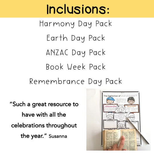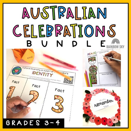 Save time and energy with our Australian Celebrations Bundle for Grade 3 and 4. Included are activity packs for Harmony Day, Earth Day, ANZAC Day, Book Week and Remembrance Day.