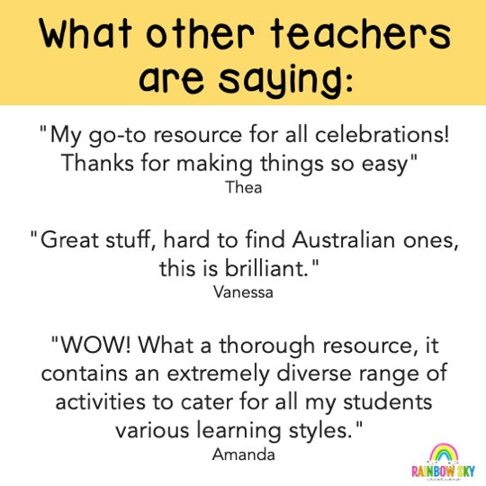 Terms of Use: Copyright of this material is reserved in accordance with the Copyright Act 1968. This purchase is for single classroom/home use only. Additional reproduction of part or all of this resource is prohibited without the written authority of Rainbow Sky Creations. All content and clipart in these files have been created by Rainbow Sky Creations and therefore remain the property of Rainbow Sky Creations.