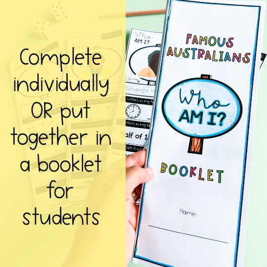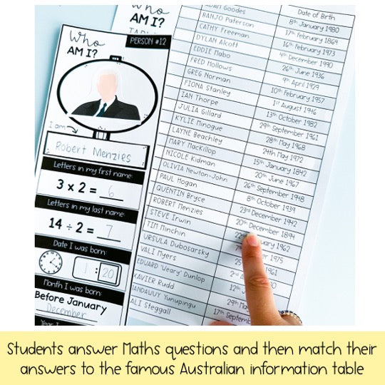 There are 26 ‘Who am I’ templates in the pack. Students complete the template and then match the information to the ‘Famous Australian Table’ in order to solve the ‘Who am I.’