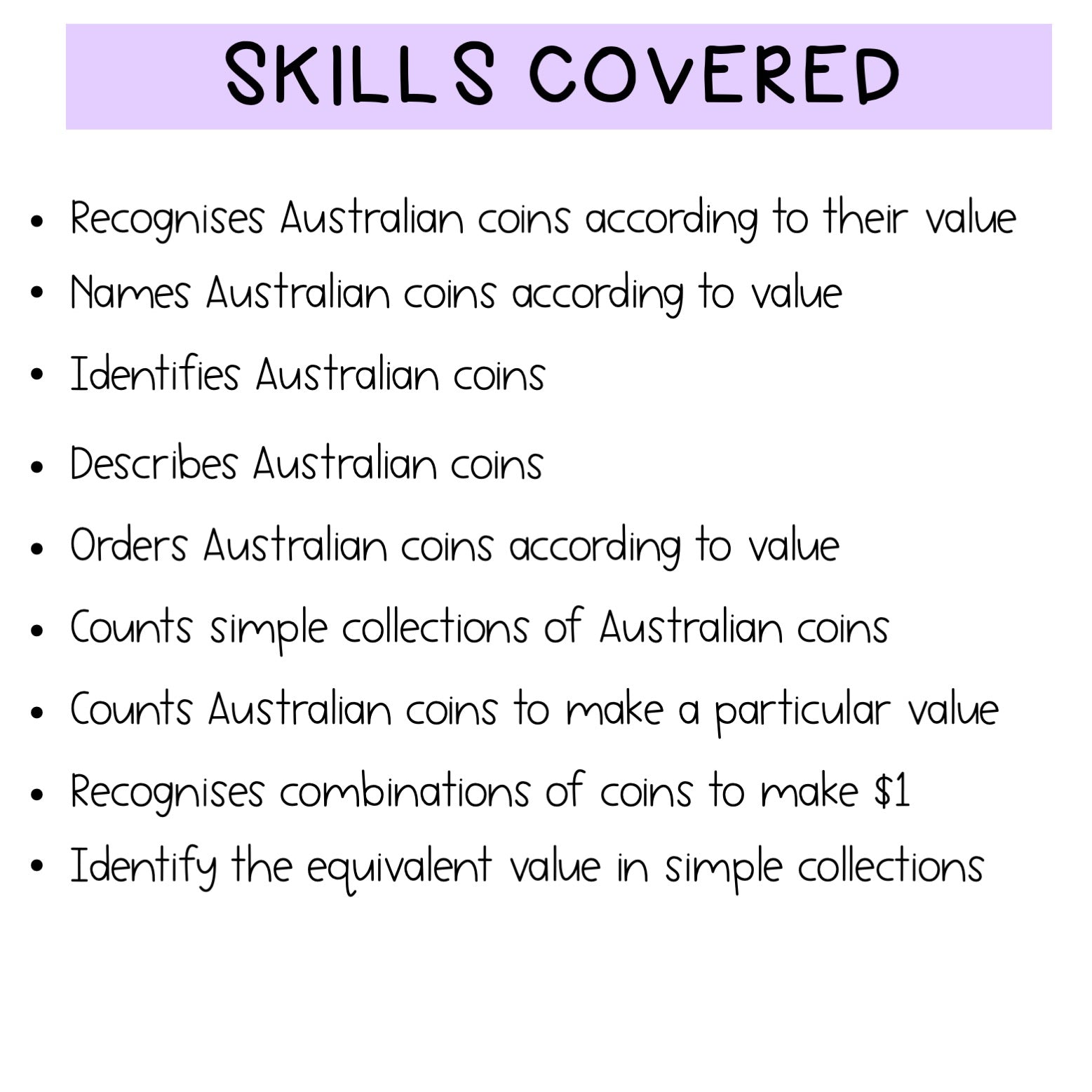 Everything you need to teach and assess Australian Money in Year 1. Included are highly engaging, time-saving activities to teach your students to count and order small collections of Australian coins and notes according to their value.