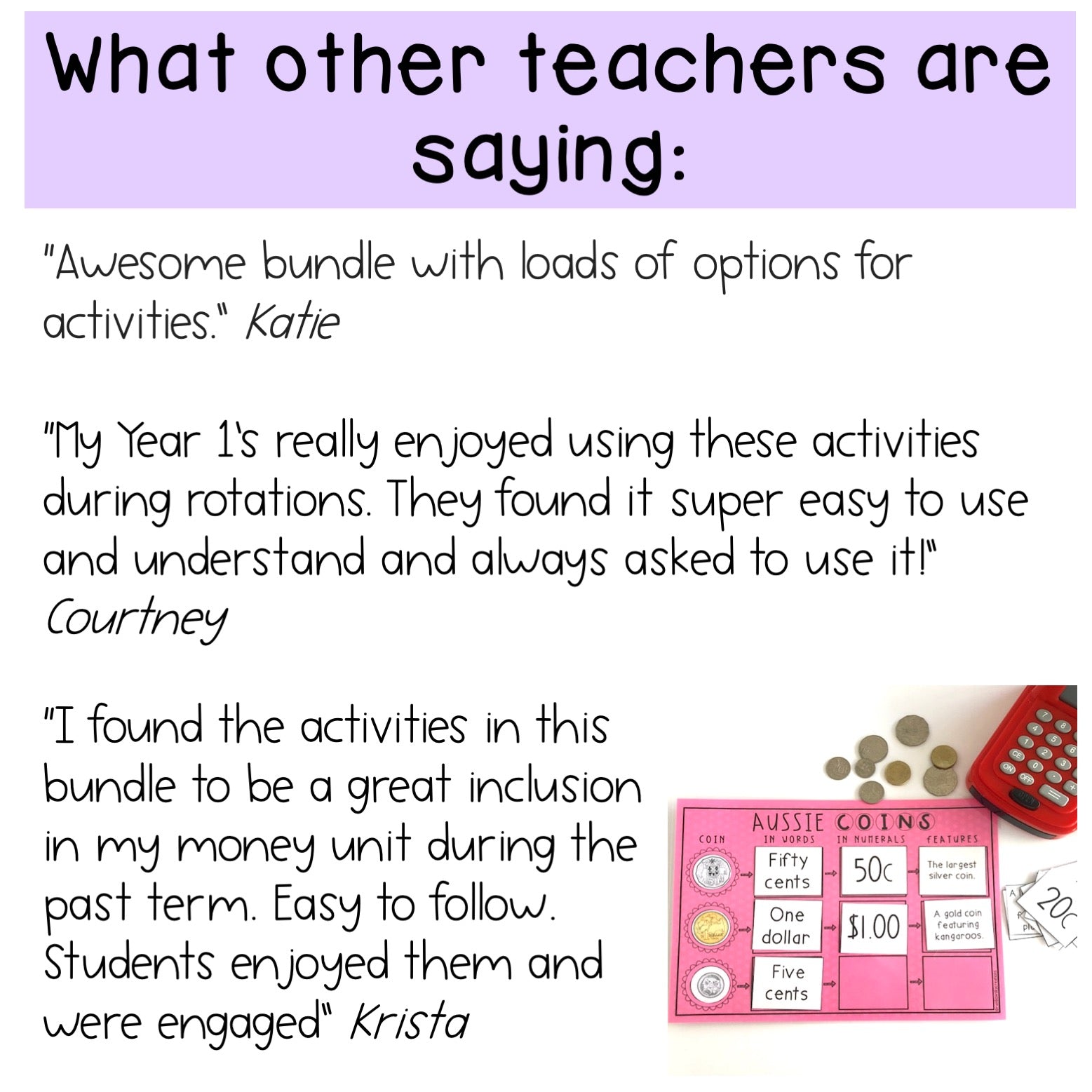 “I found the activities in this bundle to be a great inclusion in my money unit during the past term. Easy to follow. Students enjoyed them and were engaged” Krista