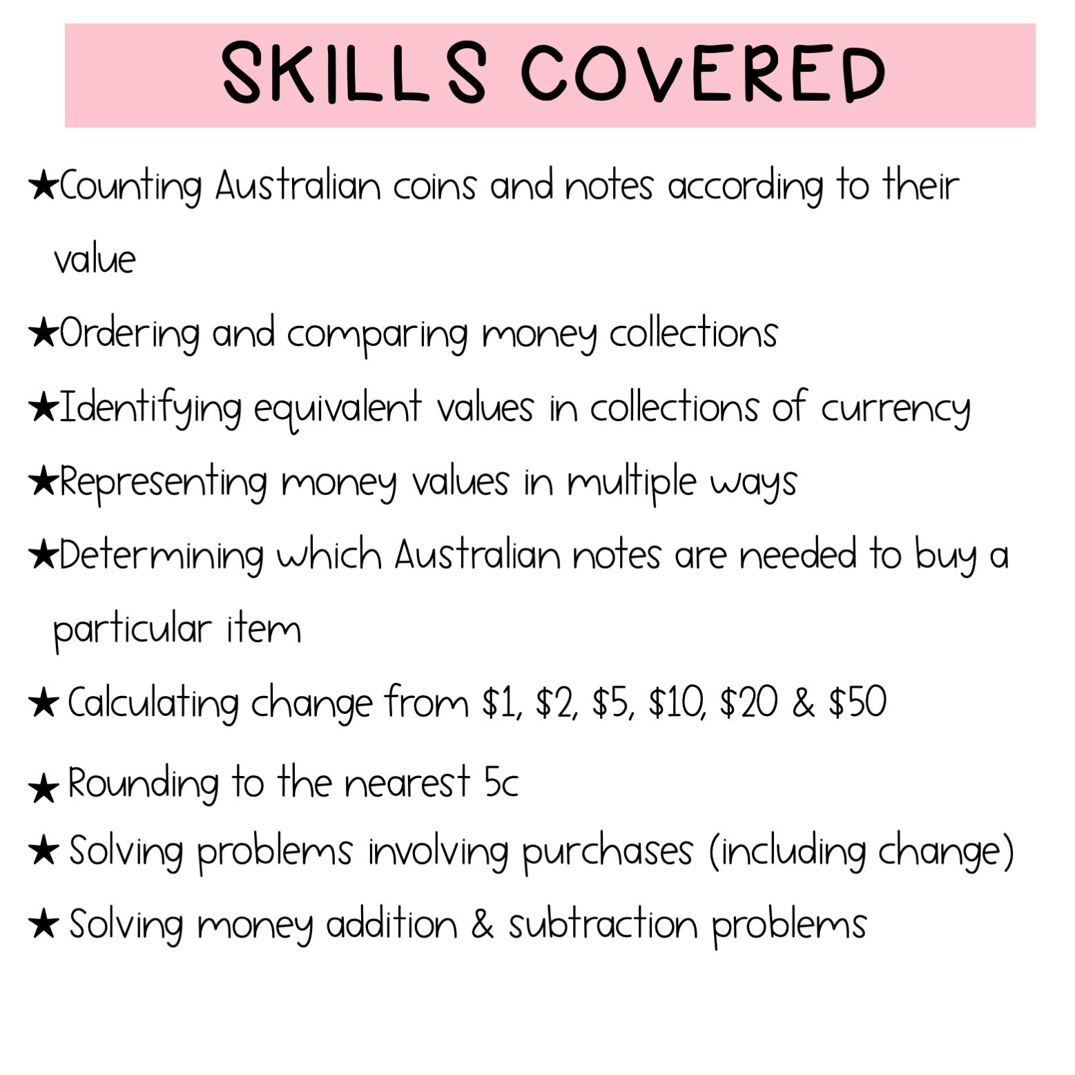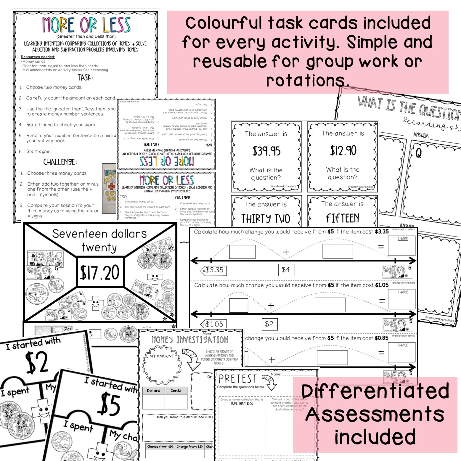 Included inside are highly engaging, time-saving activities to teach your students to count, sort, round, add and subtract Australian currency (including calculating change) as well as a variety of assessments and teacher checklists.