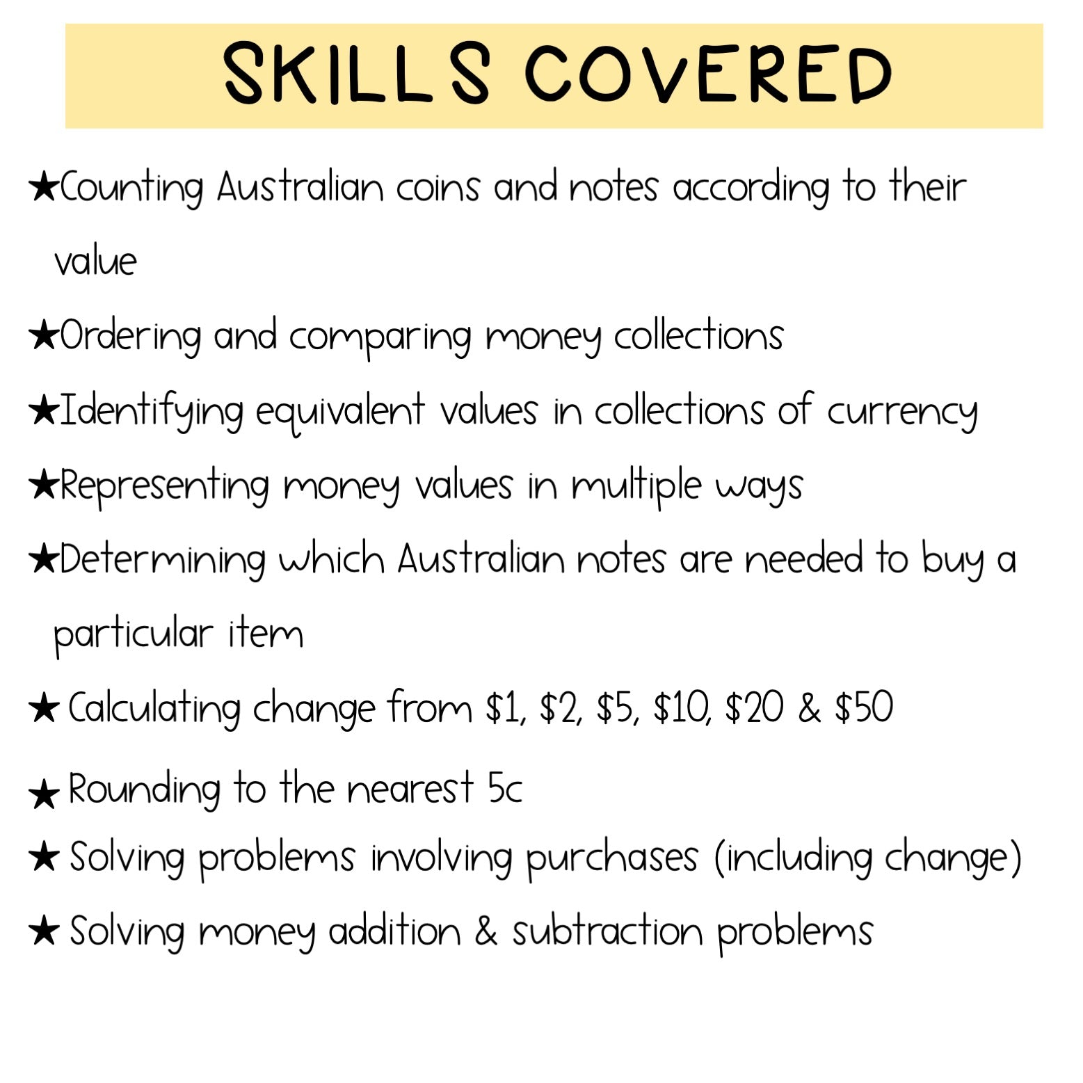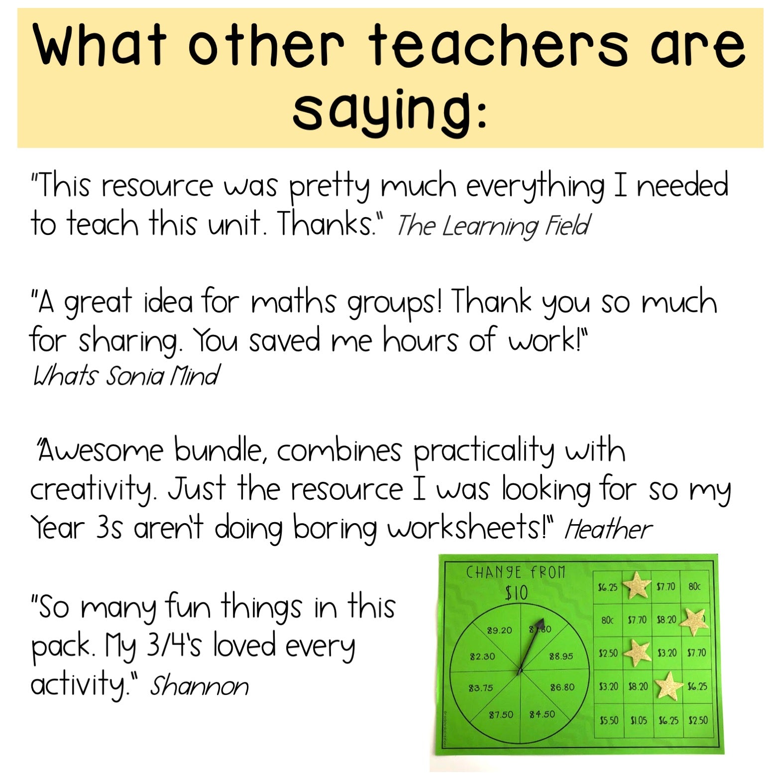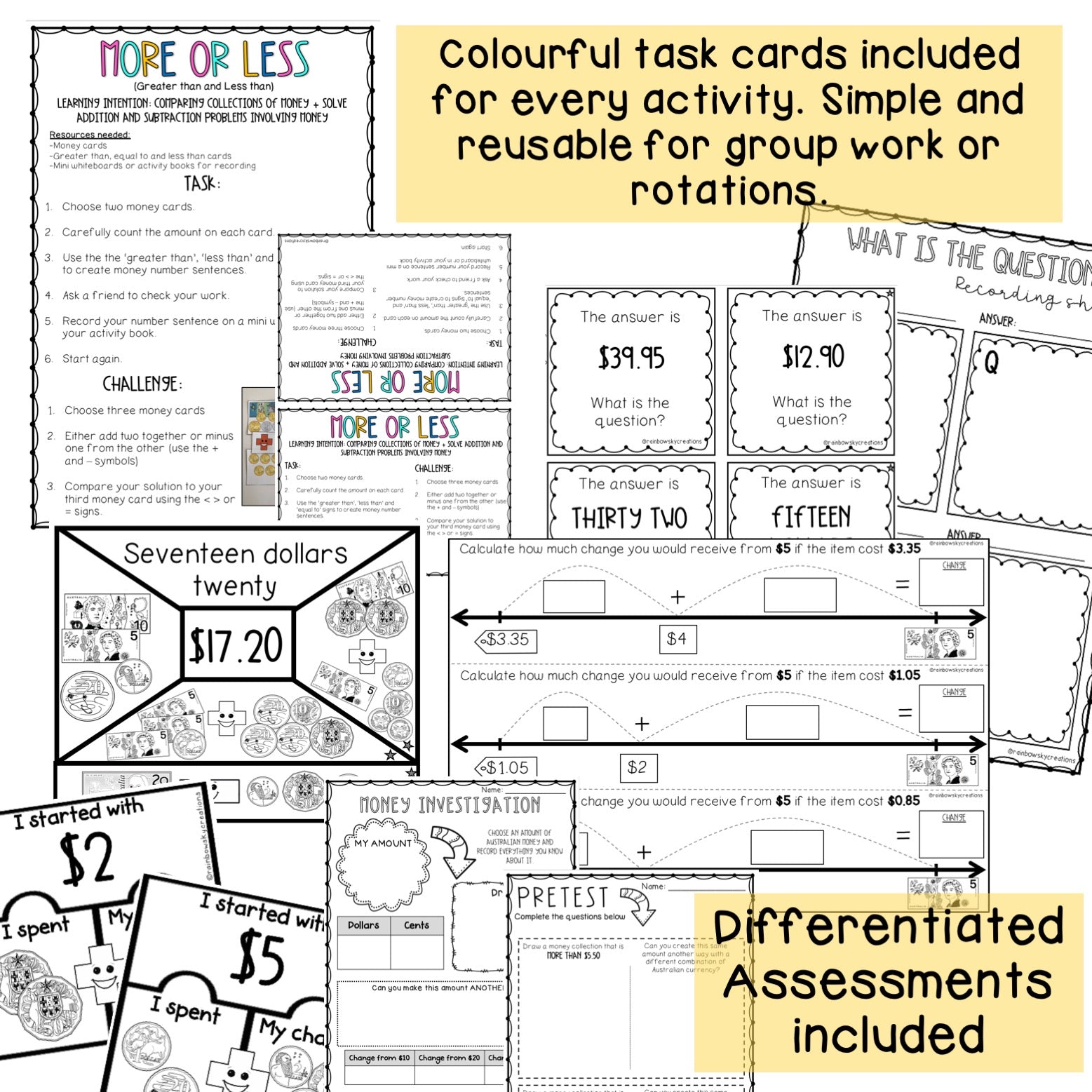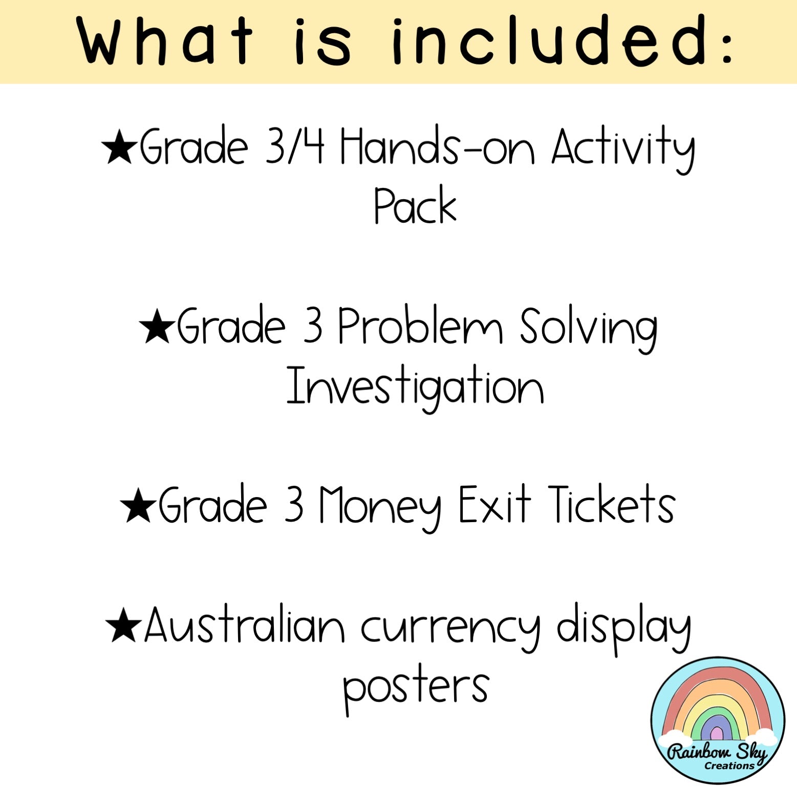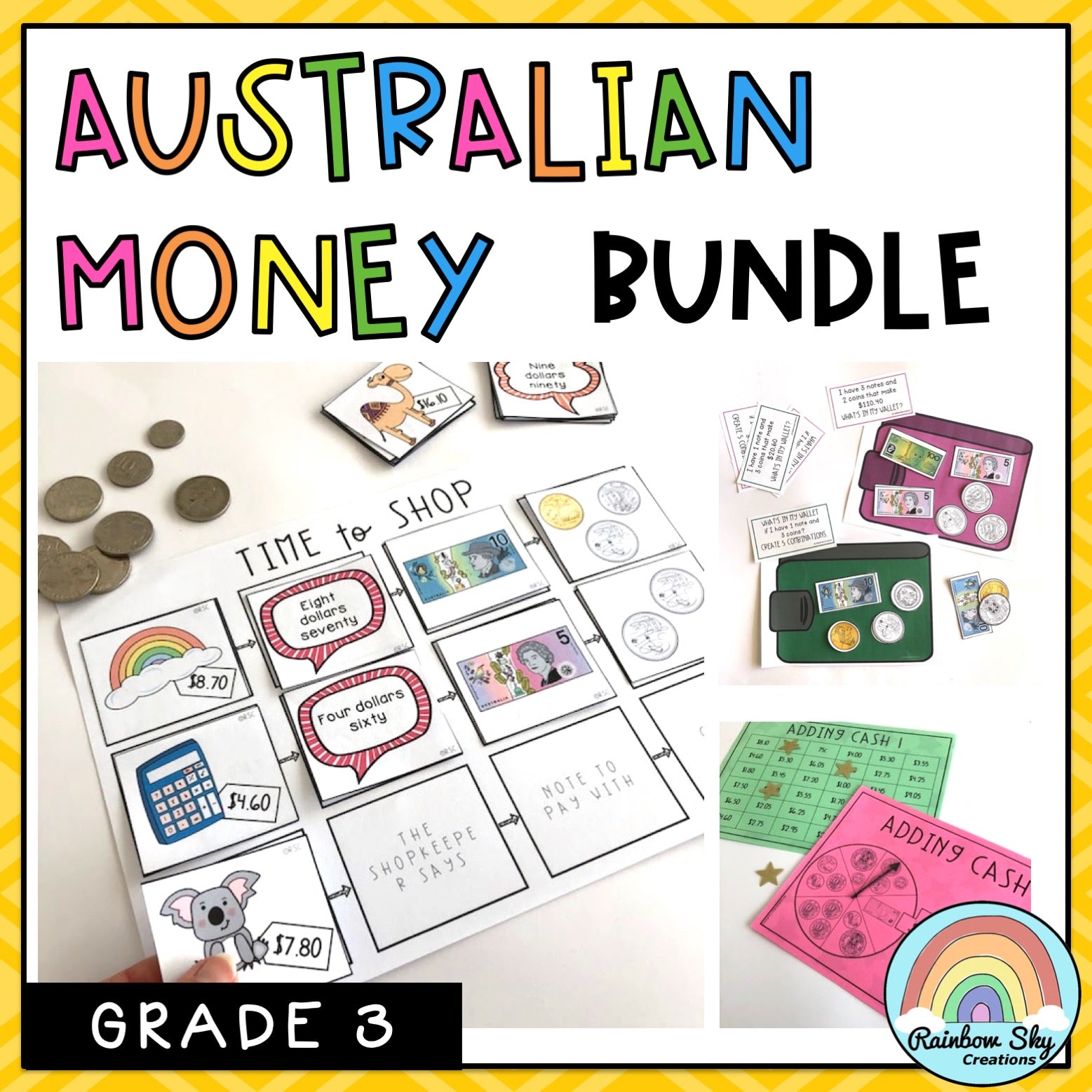 Everything you need to teach and assess Aussie Money in Year 3. This bundle includes 4 of our popular money activities for Grade 3 as well as our Australian currency posters. Included inside are highly engaging, time-saving activities to teach your students to count, sort, round, add and subtract Australian currency (including calculating change) as well as a variety of assessments and teacher checklists.