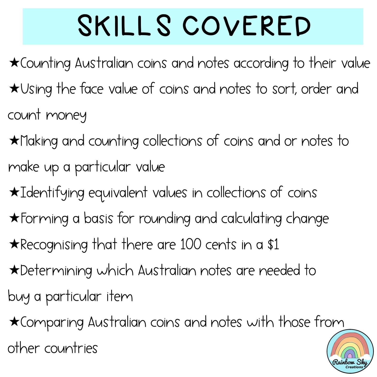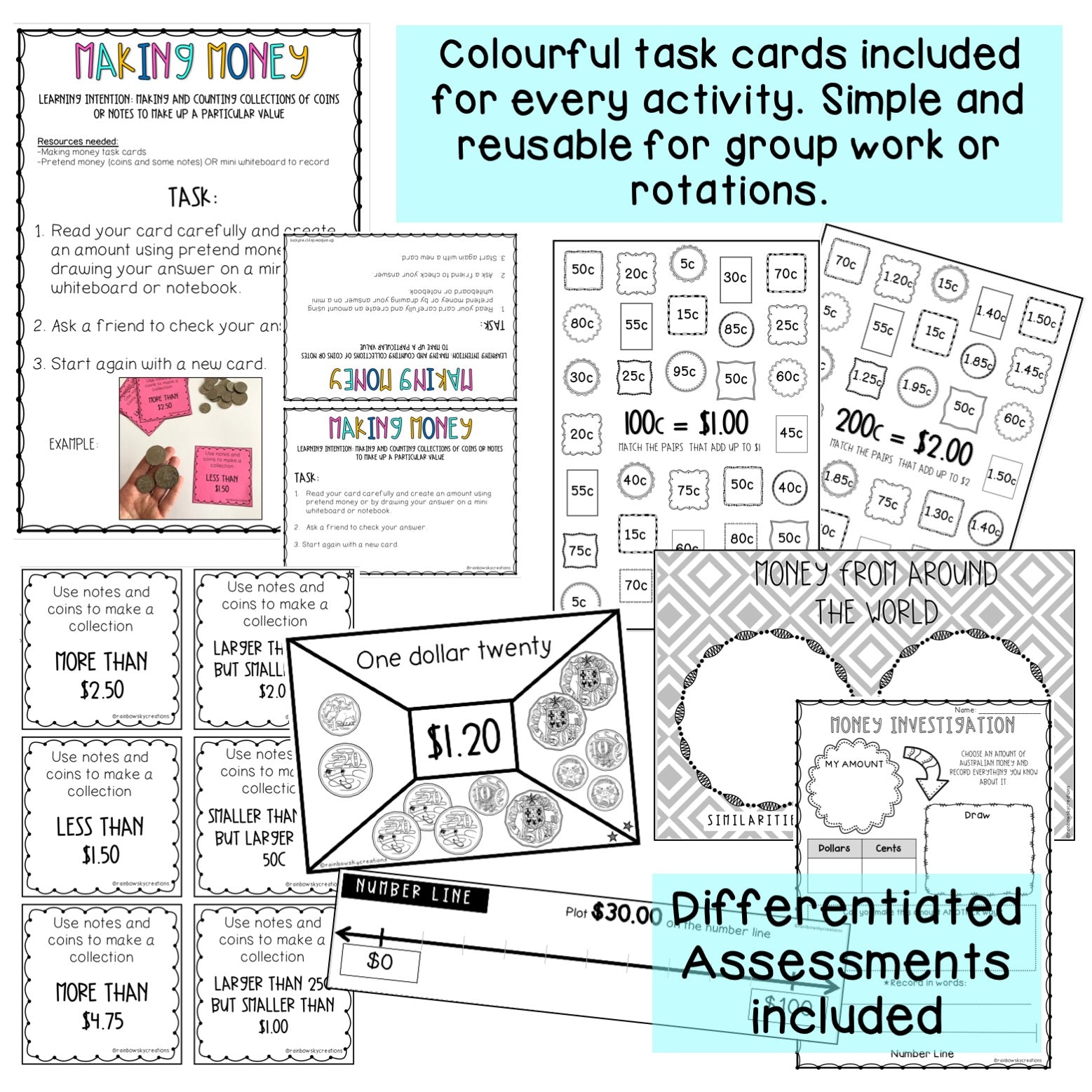 Everything you need to teach and assess Australian Money in Year 2. This bundle includes 4 of our popular money activities for Grade 2 as well as our Australian currency posters. Included inside are highly engaging, time-saving activities to teach your students to count and order small collections of Australian coins and notes according to their value.
