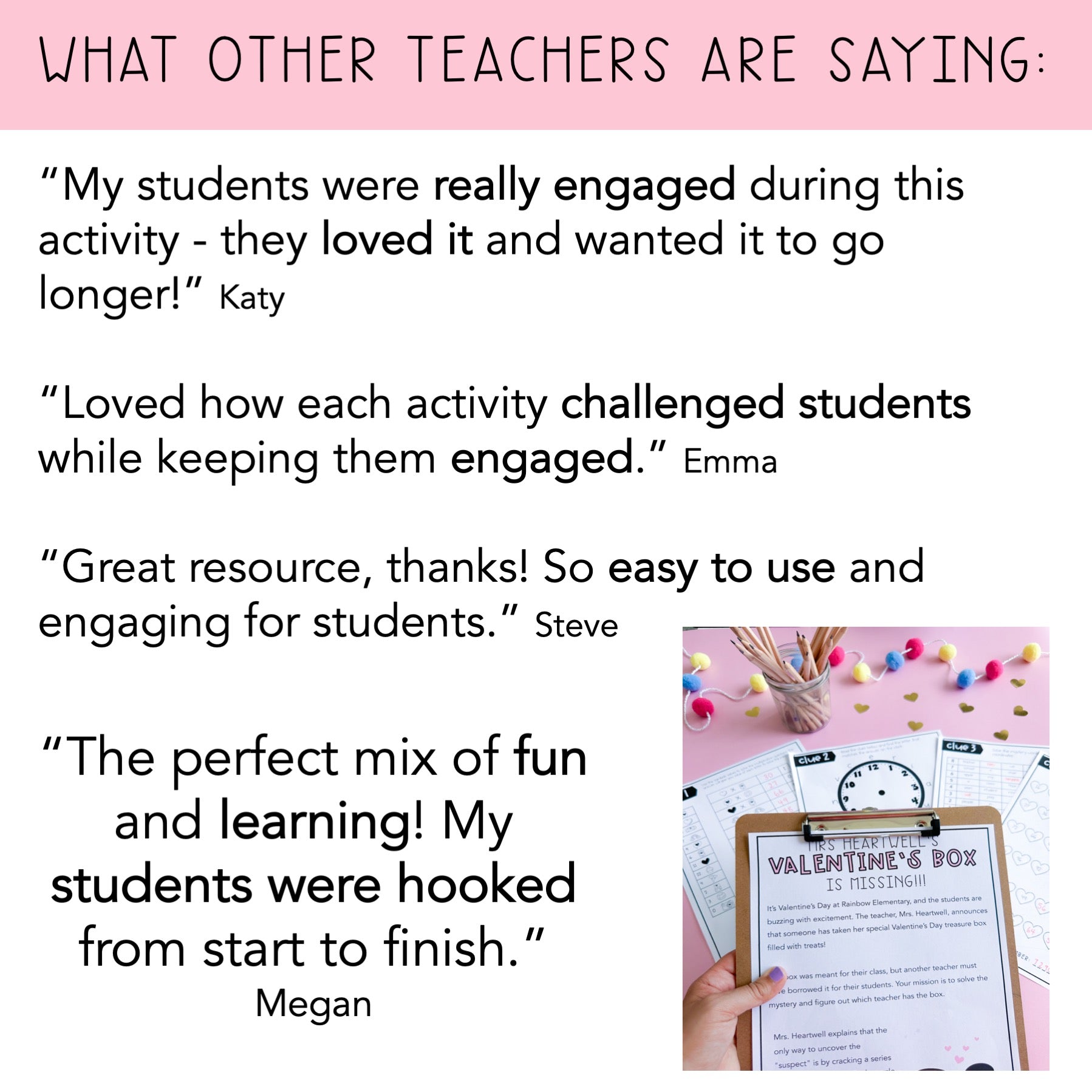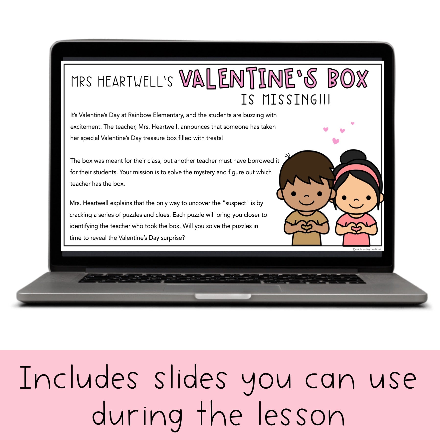 Once your class solve the mystery, present them with a Valentine’s Day box with treats for them inside (just like Mrs. Heartwell in the story).