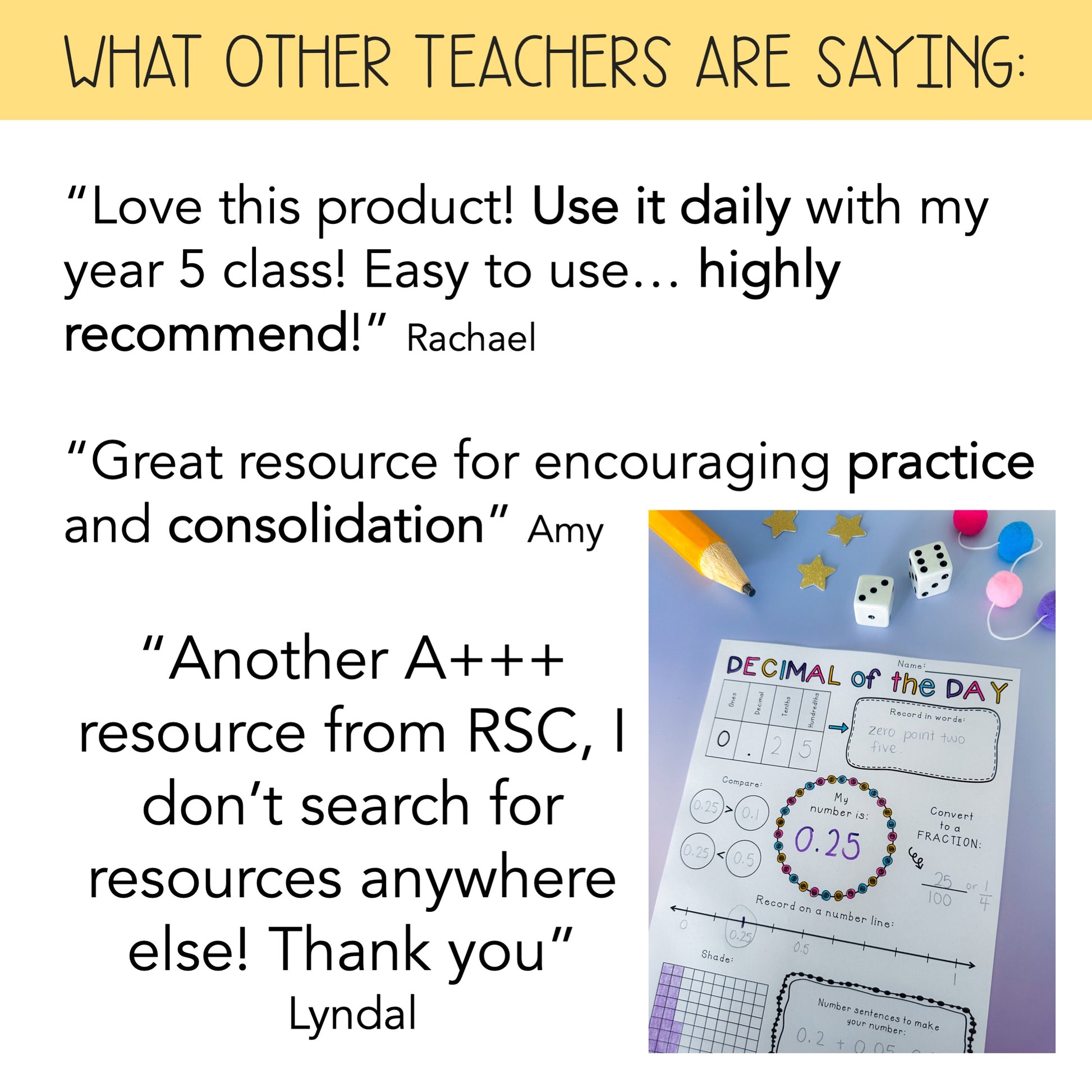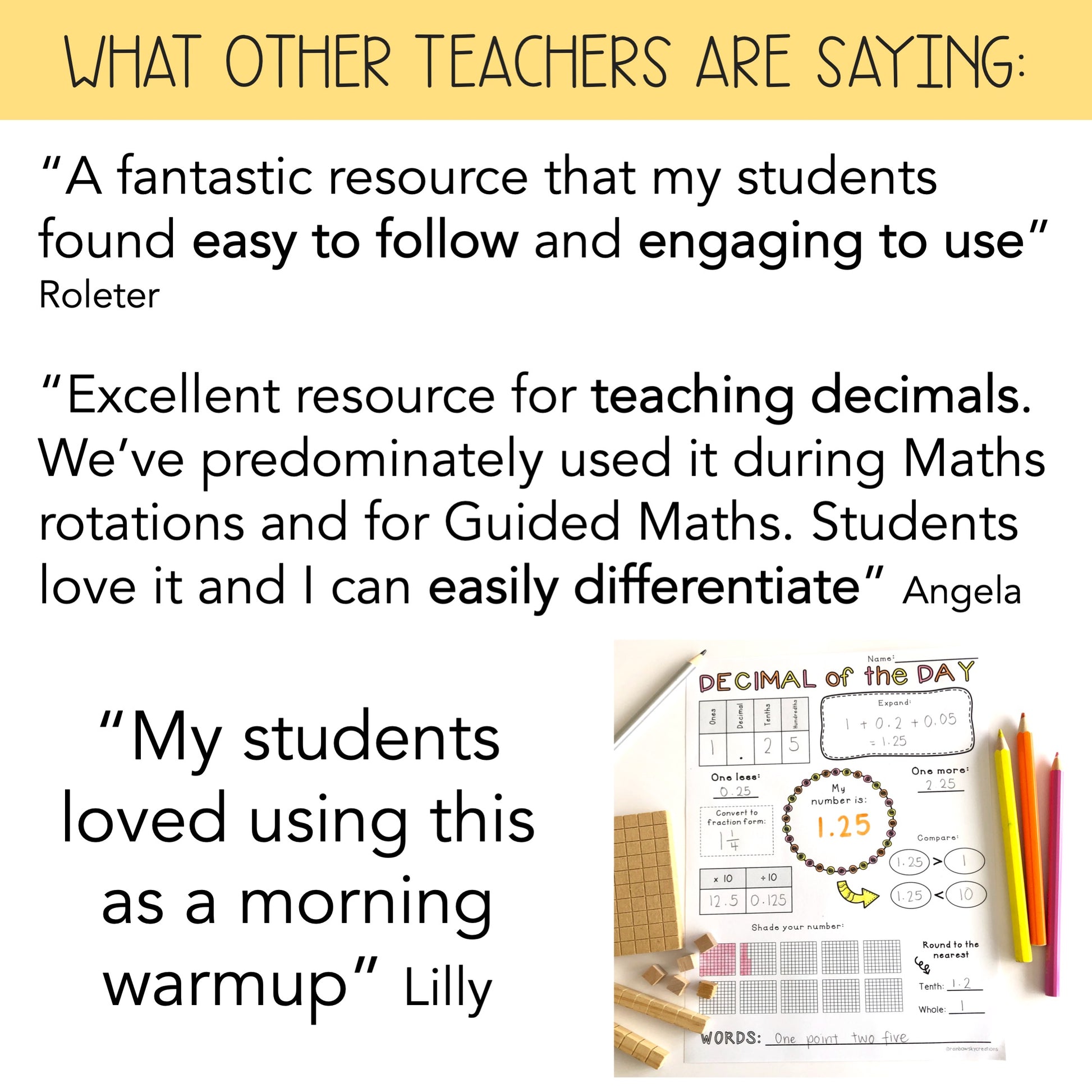 The ultimate math warmup focusing on decimals. These Decimal of the Day templates have been designed for you to engage students in learning all about how the number system works when working with numbers that include decimals.
