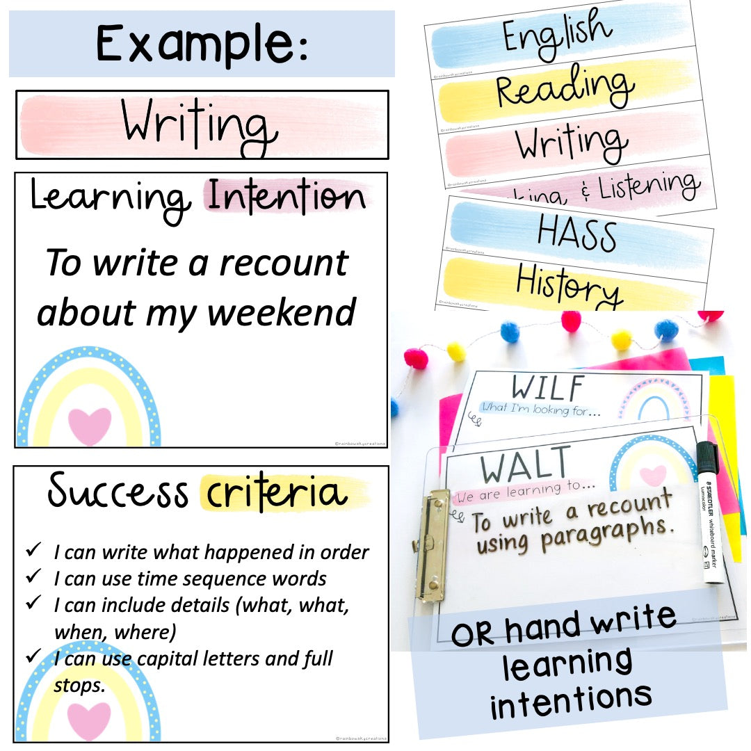 - 12 Labels: Learning intention, Learning objective, Learning goal, Success criteria, Steps to success, WALT, WALF, WILF, WILL, TIB, TMB, I can…
