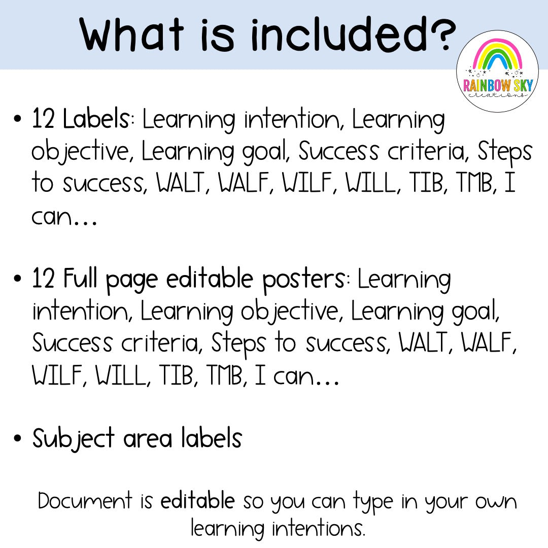 - 12 Full page editable posters: Learning intention, Learning objective, Learning goal, Success criteria, Steps to success, WALT, WALF, WILF, WILL, TIB, TMB, I can…