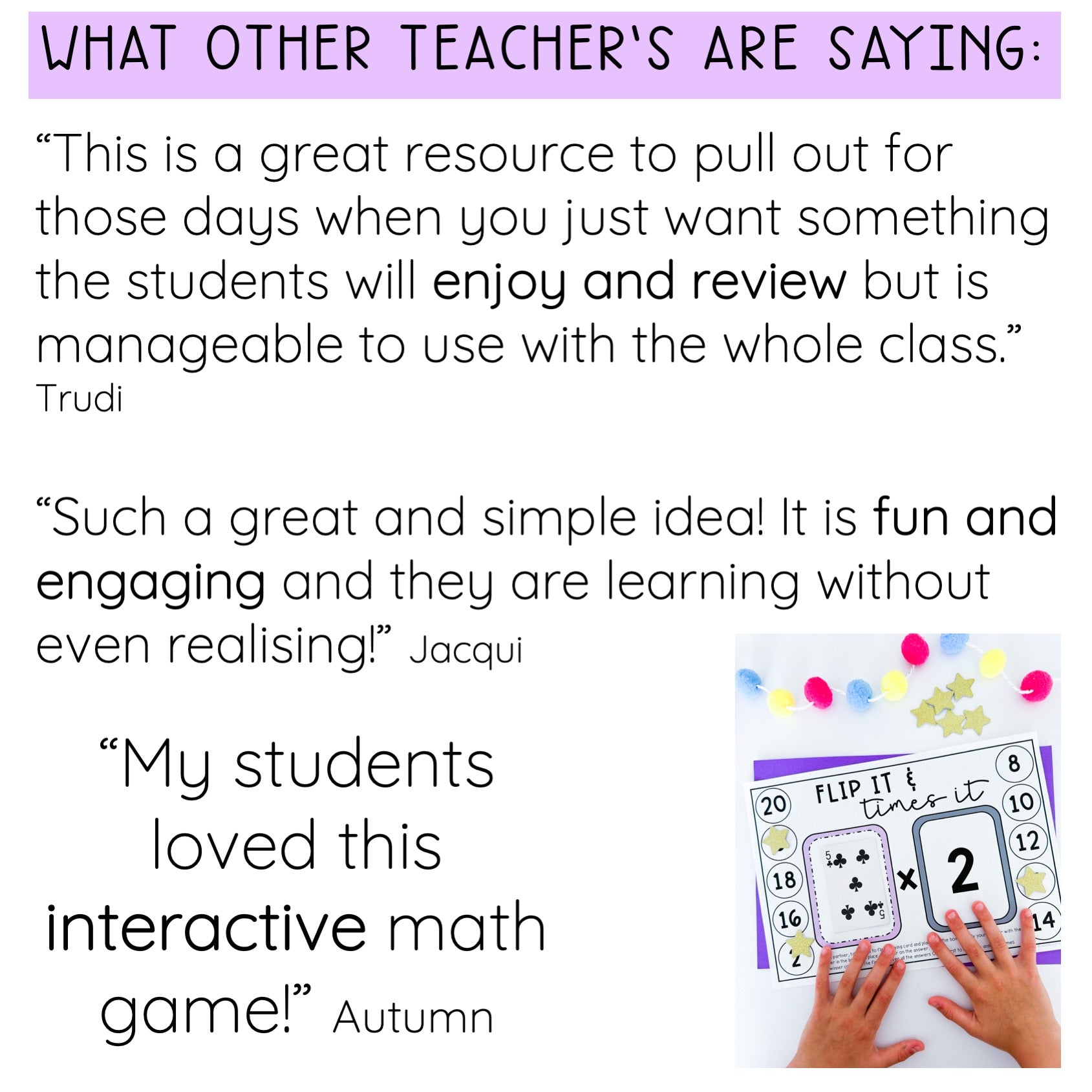 “This is a great resource to pull out for those days when you just want something the students will enjoy and review but is manageable to use with the whole class.” Trudi