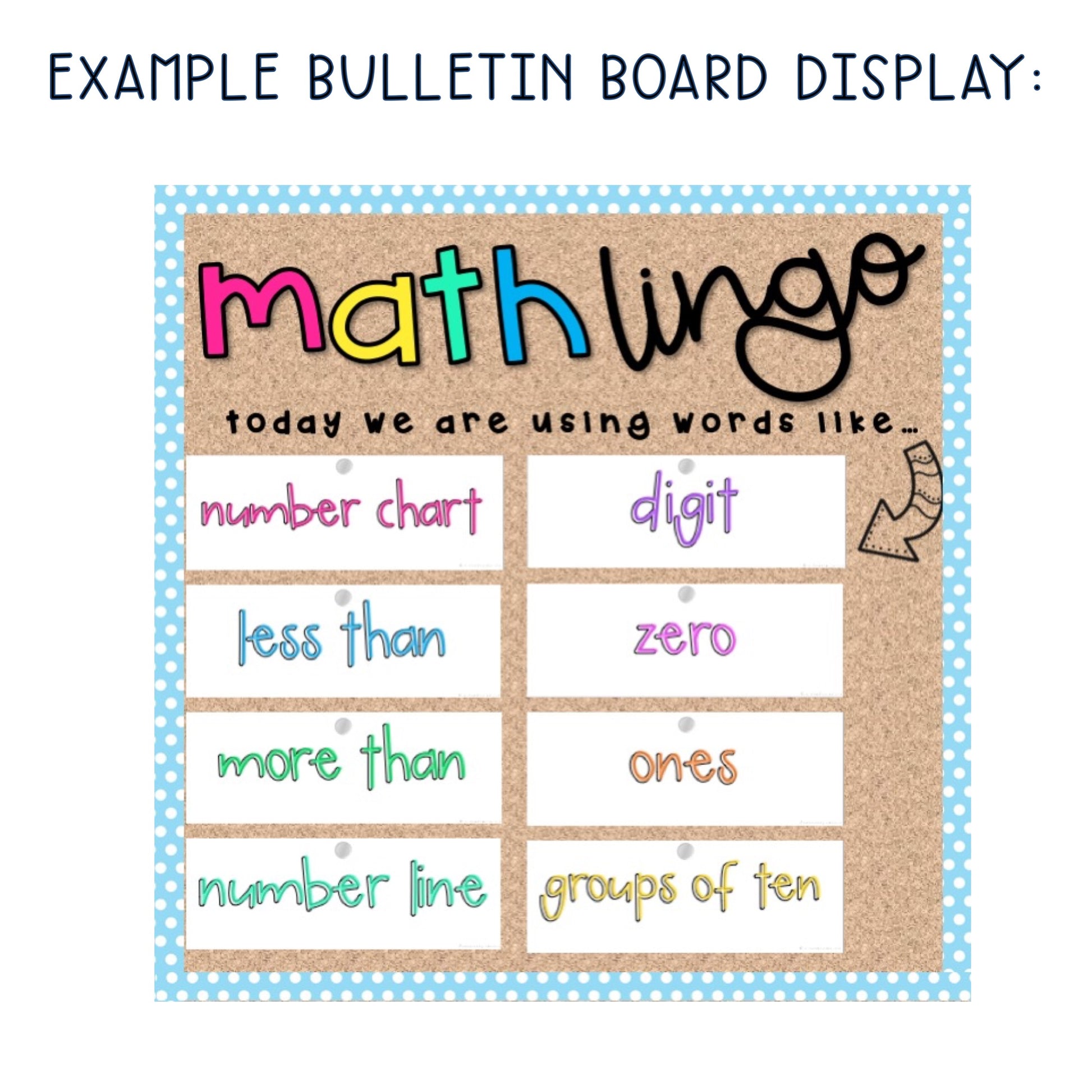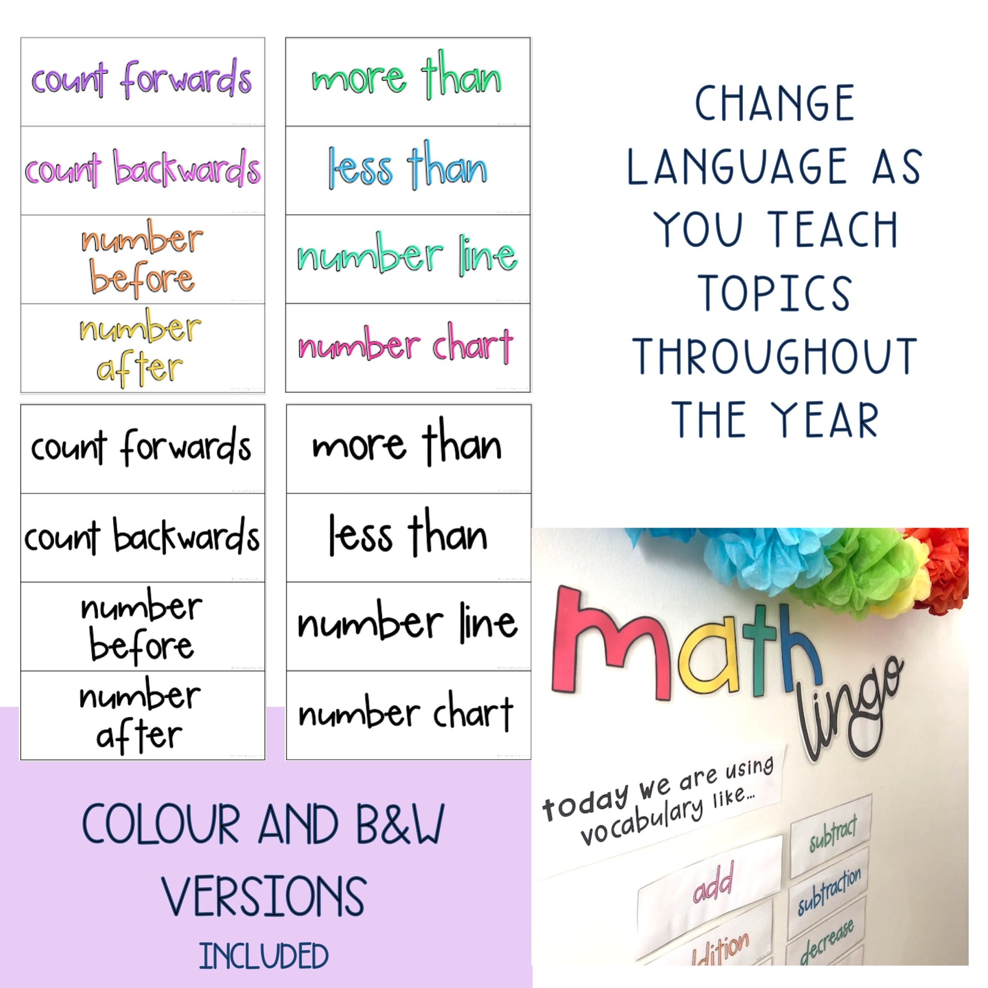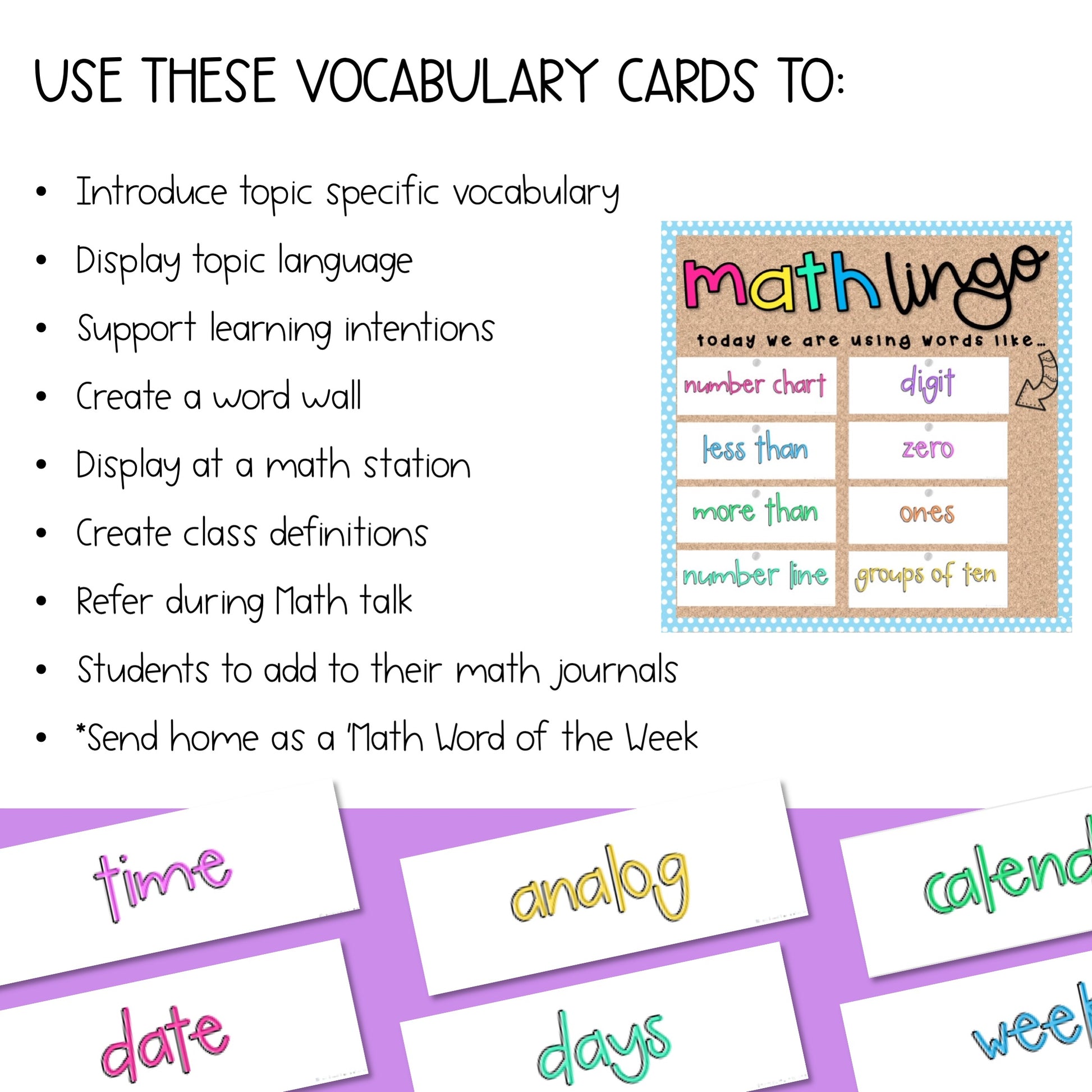 Each card has a single word so they are easy to read and reference when discussing and introducing familiar and unfamiliar language in Mathematics.