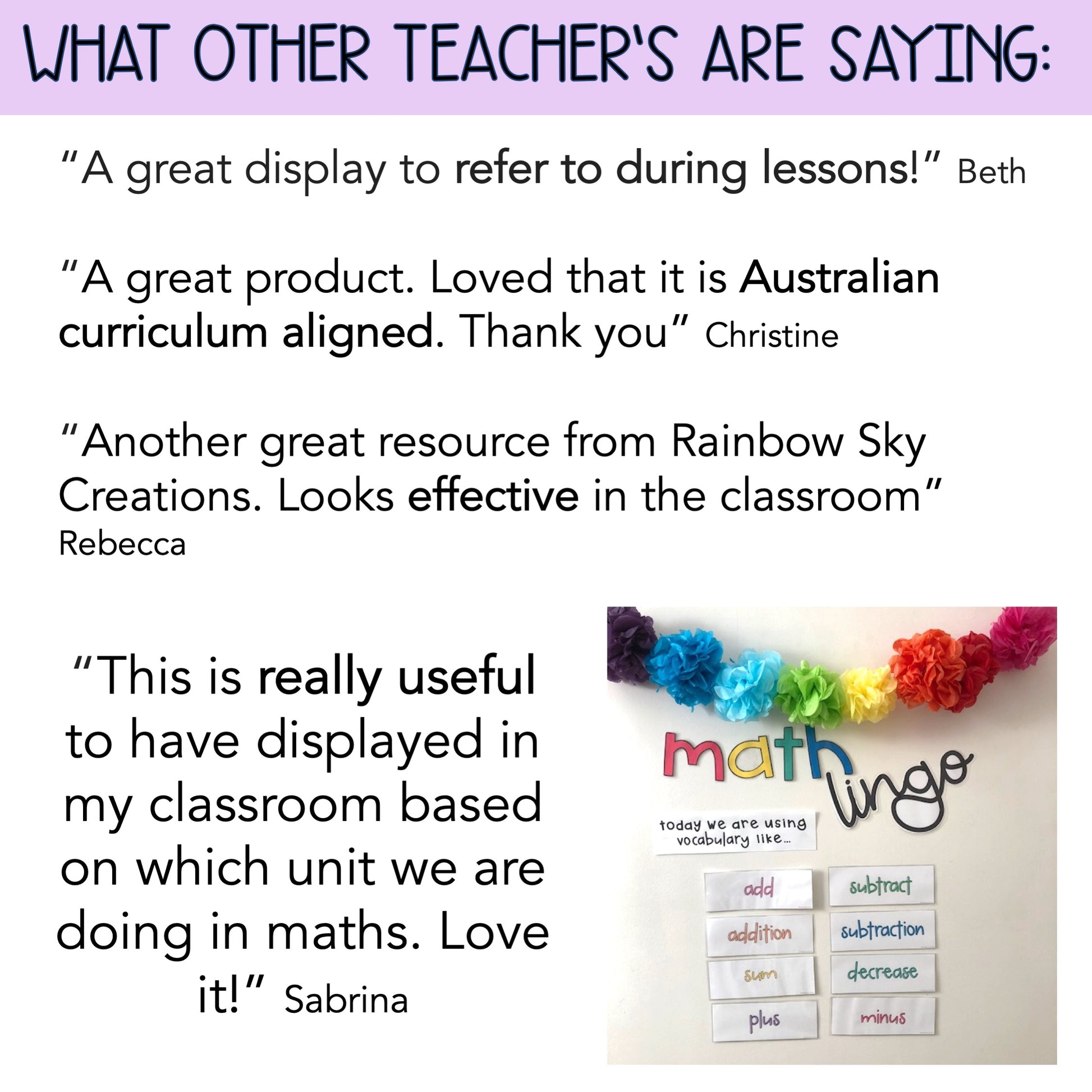 Help reinforce the language involved in Mathematics with these easy to read, eye catching, curriculum aligned vocabulary cards. Words have been carefully chosen to match ACARA standards (Australian curriculum) for this grade level and will build proficiency, fluency and confidence in Maths.