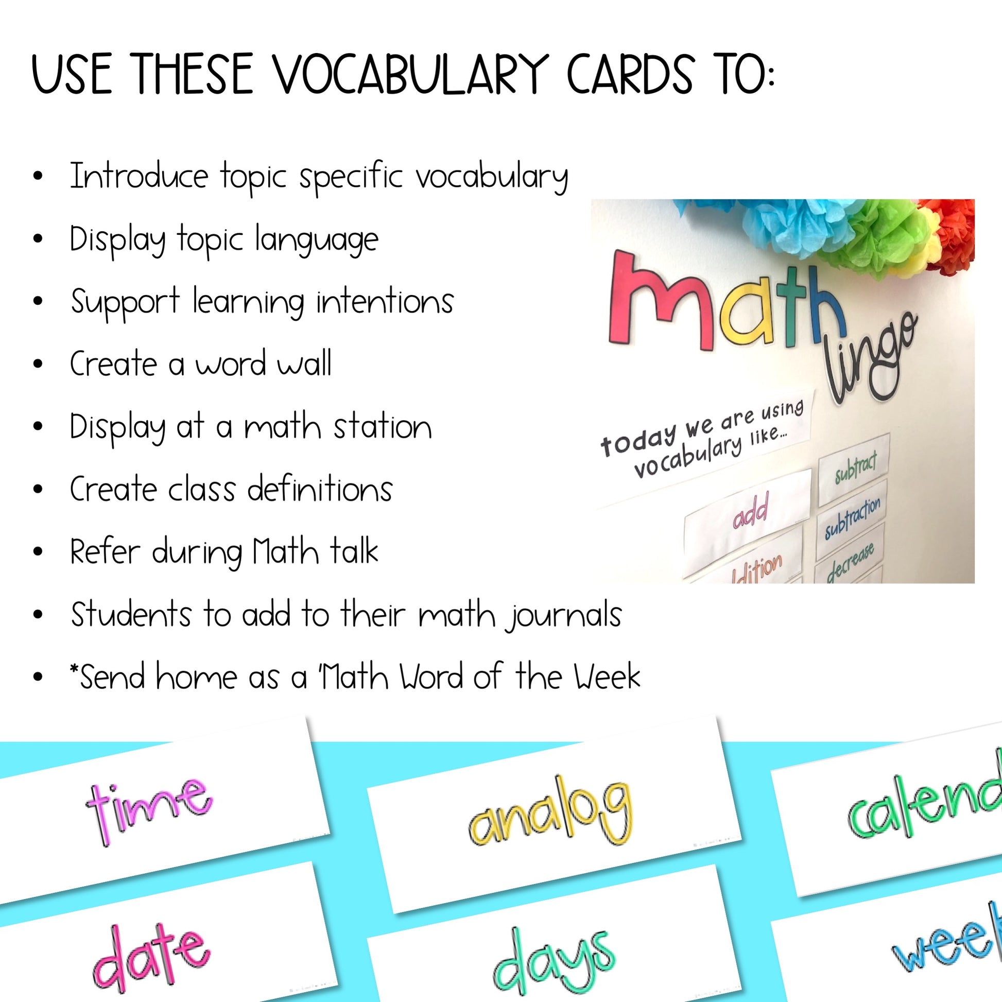 Each card has a single word so they are easy to read and reference when discussing and introducing familiar and unfamiliar language in Mathematics.