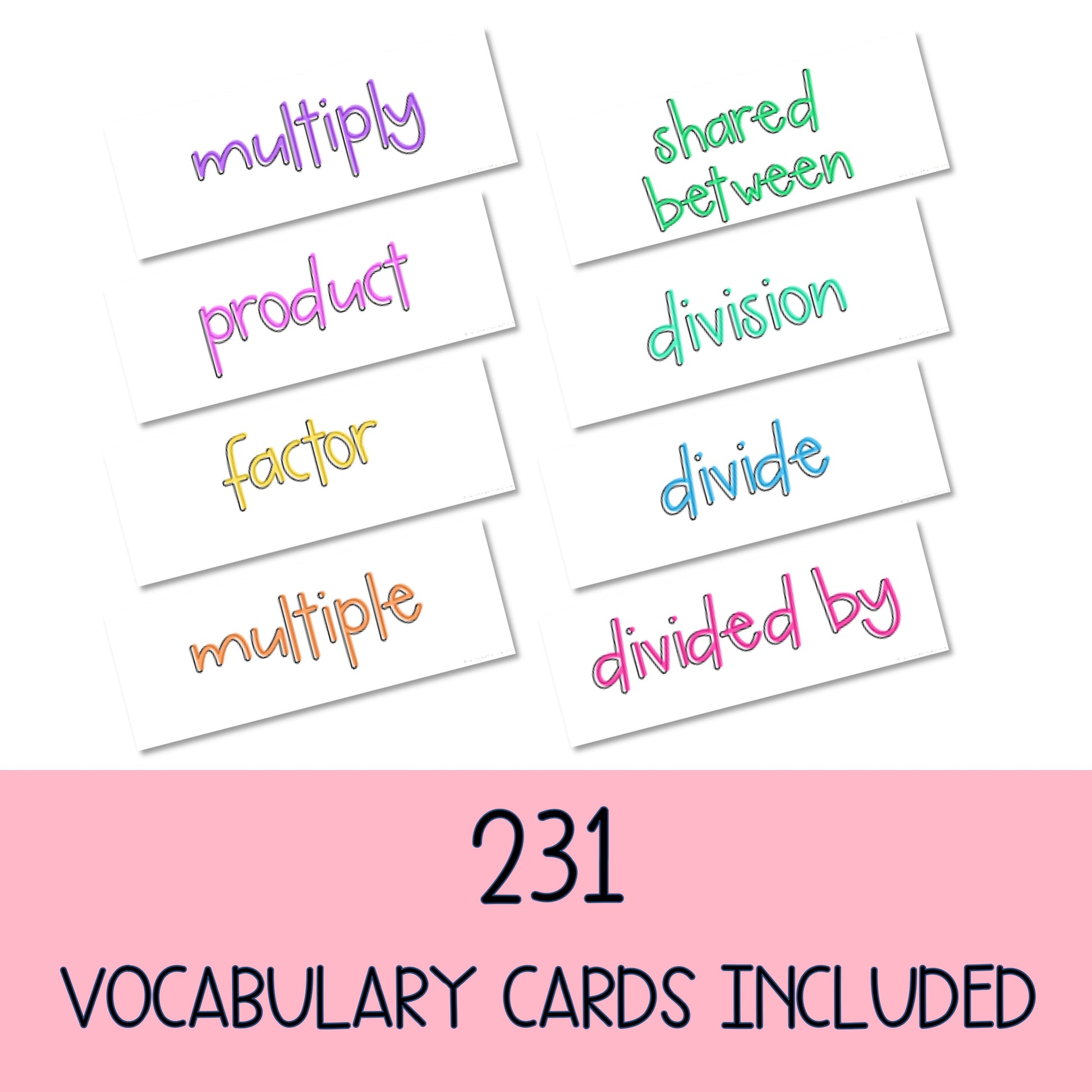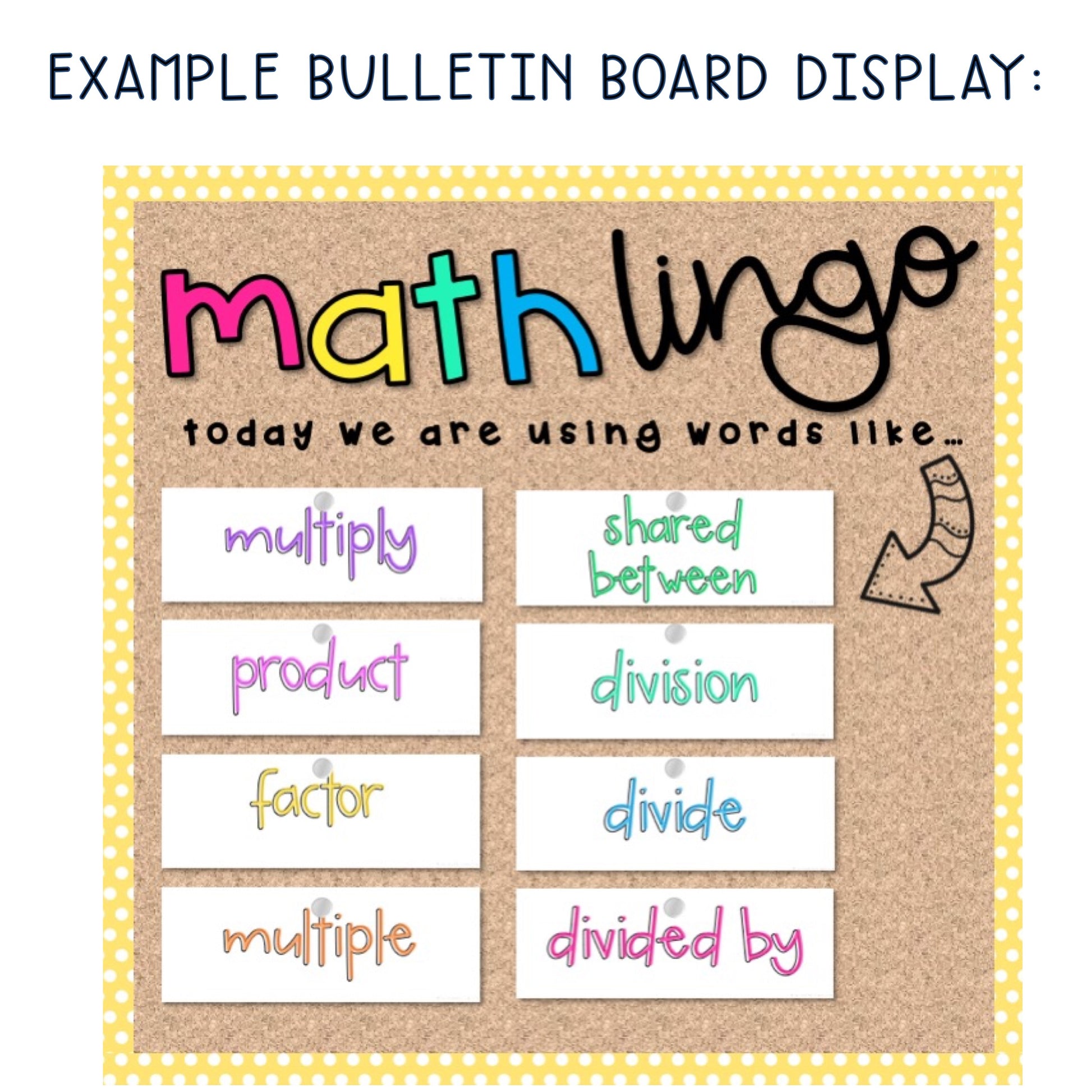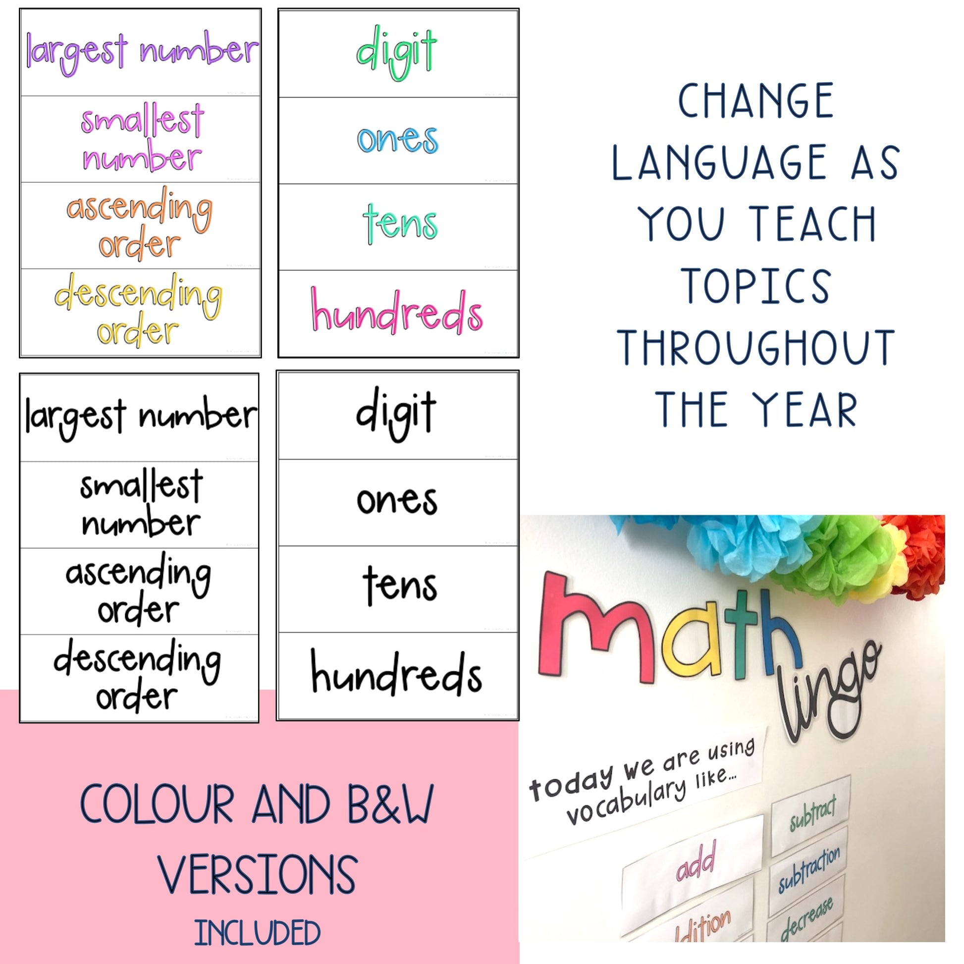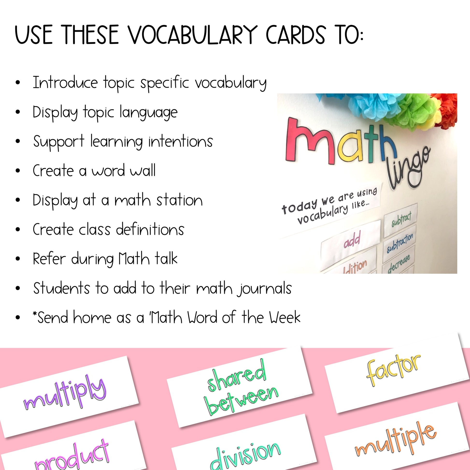 Each card has a single word so they are easy to read and reference when discussing and introducing familiar and unfamiliar language in Mathematics.