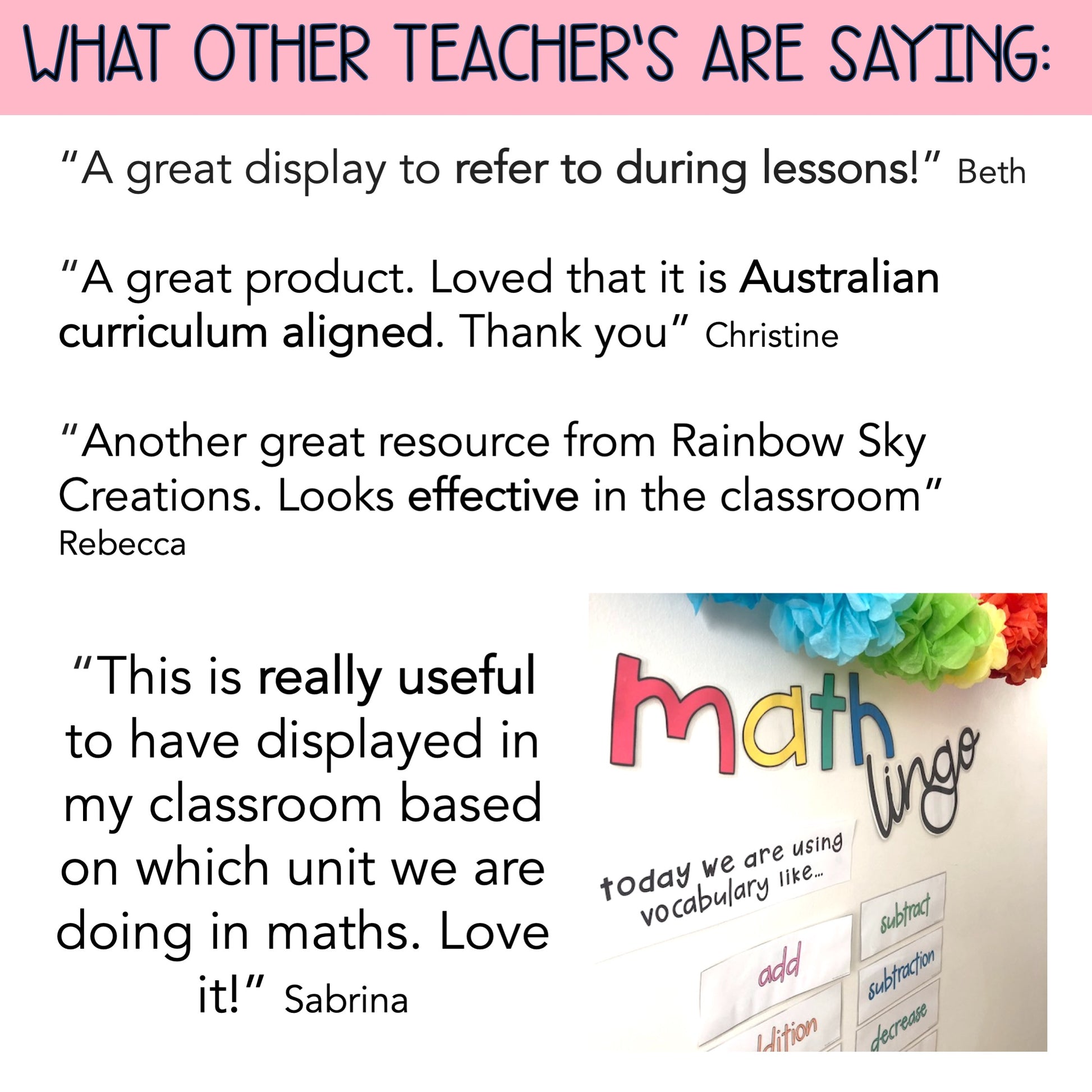 Help reinforce the language involved in Mathematics with these easy to read, eye-catching, curriculum aligned vocabulary cards. Words have been carefully chosen to match ACARA standards (Australian curriculum) for this grade level and will build proficiency, fluency and confidence in Maths.