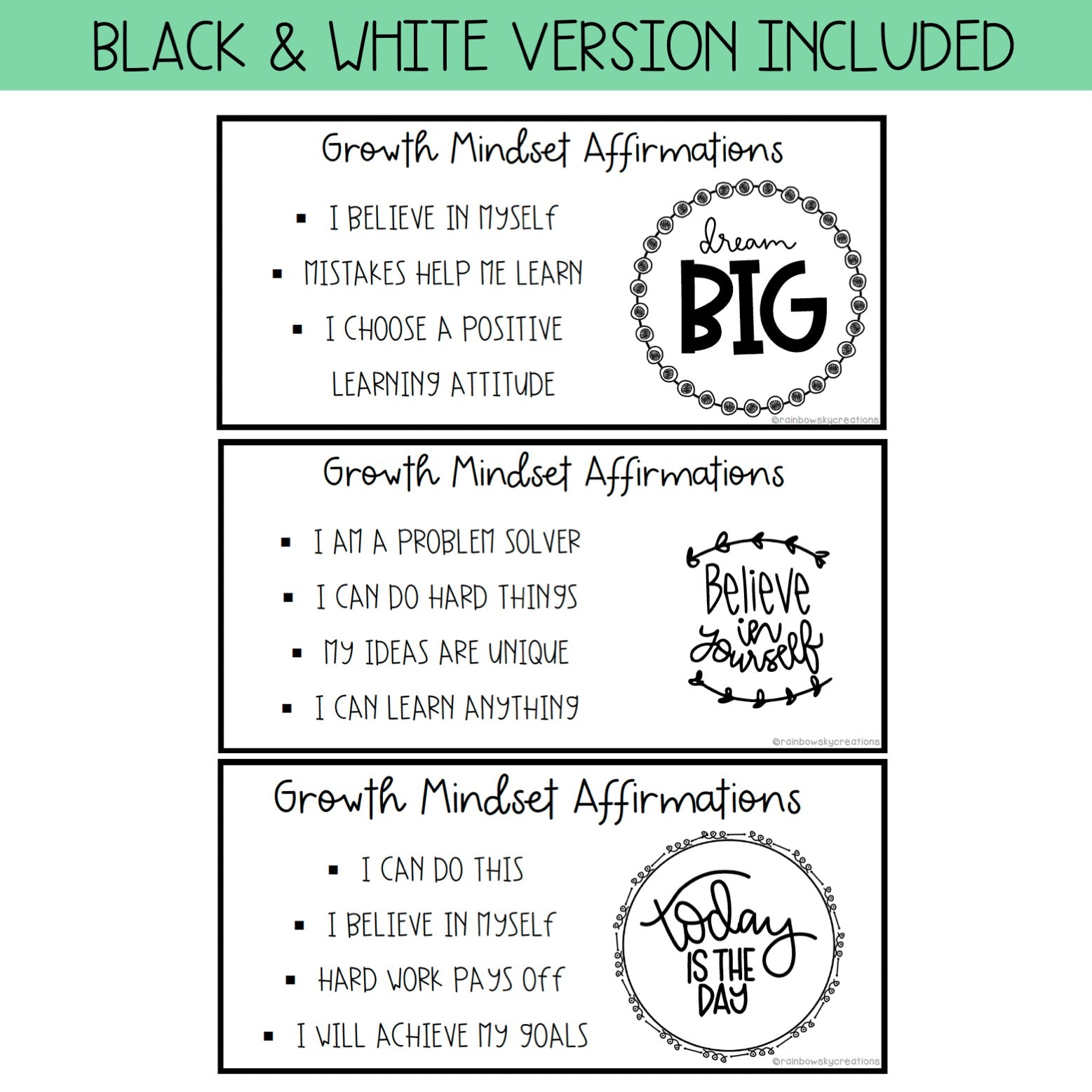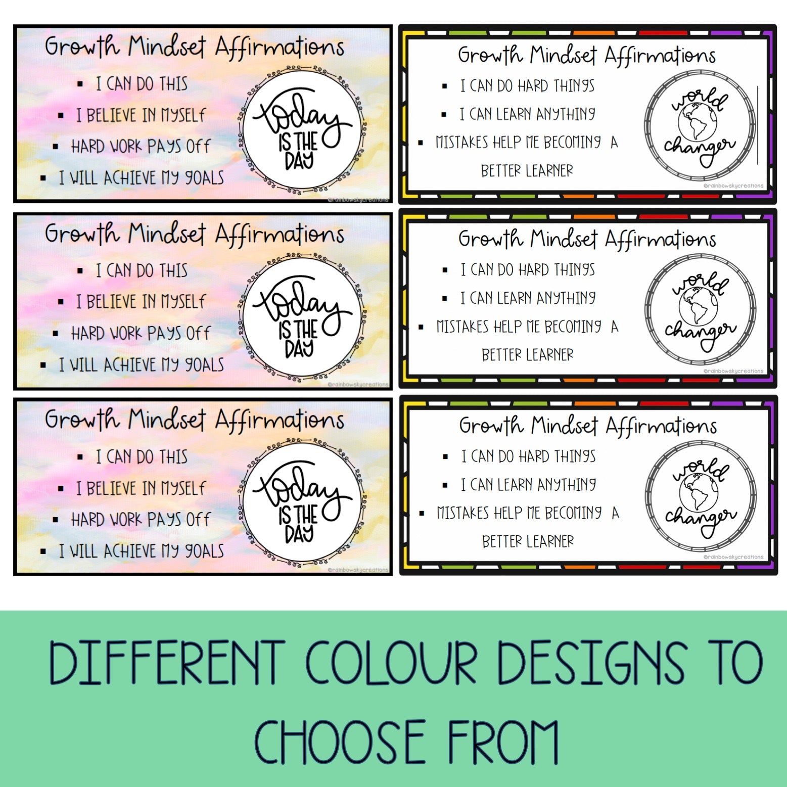 - 6 different types of growth mindset desk plates with different affirming phrases and motivational quote.