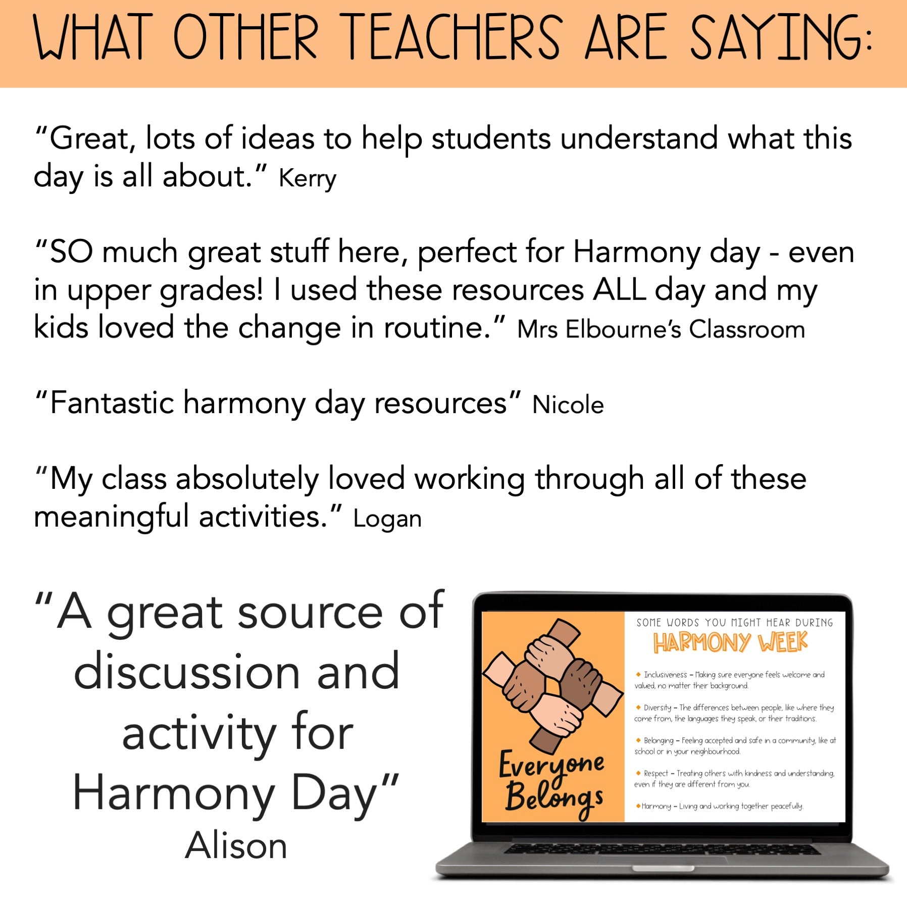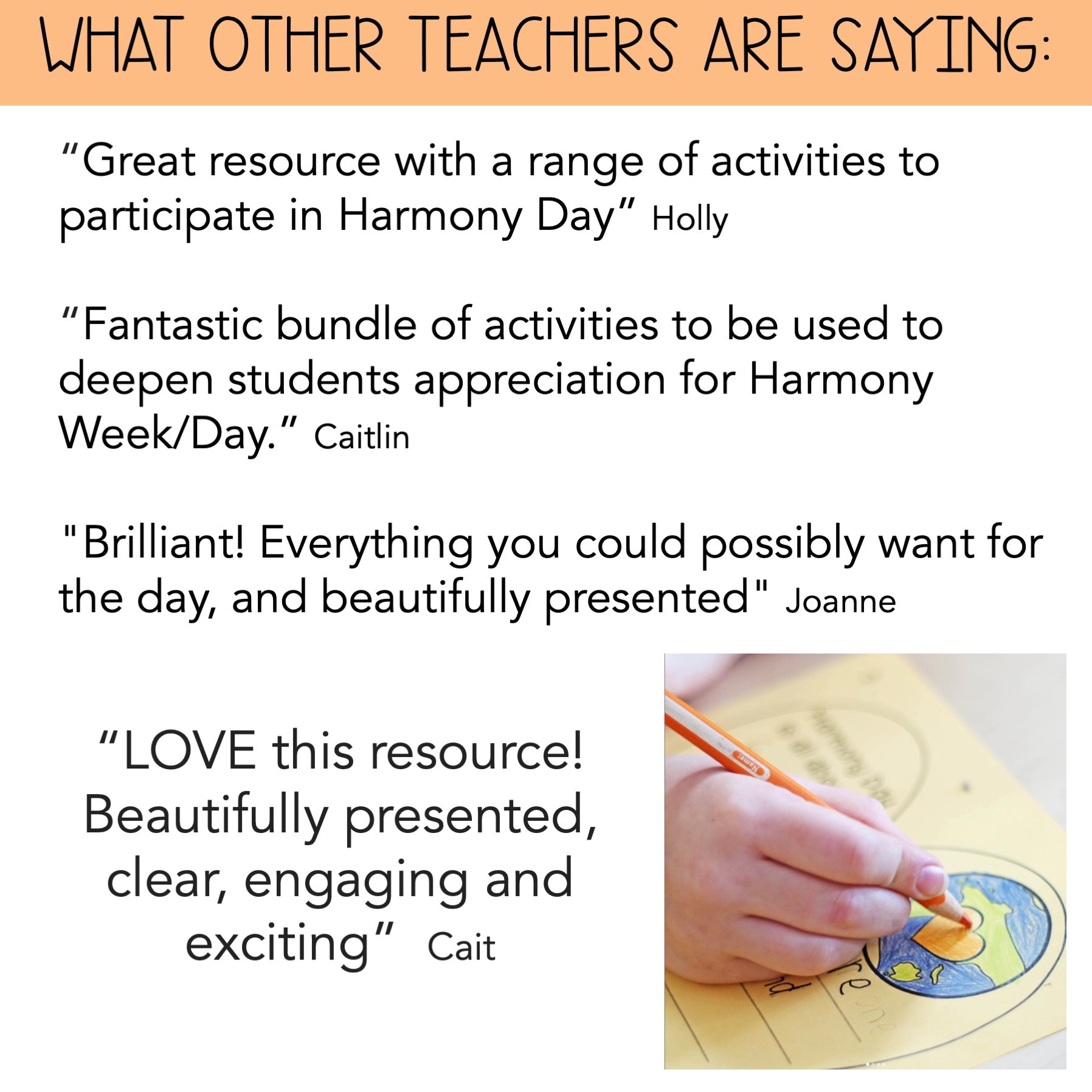 “SO much great stuff here, perfect for Harmony day - even in upper grades! I used these resources ALL day and my kids loved the change in routine.” Mrs Elbourne’s Classroom