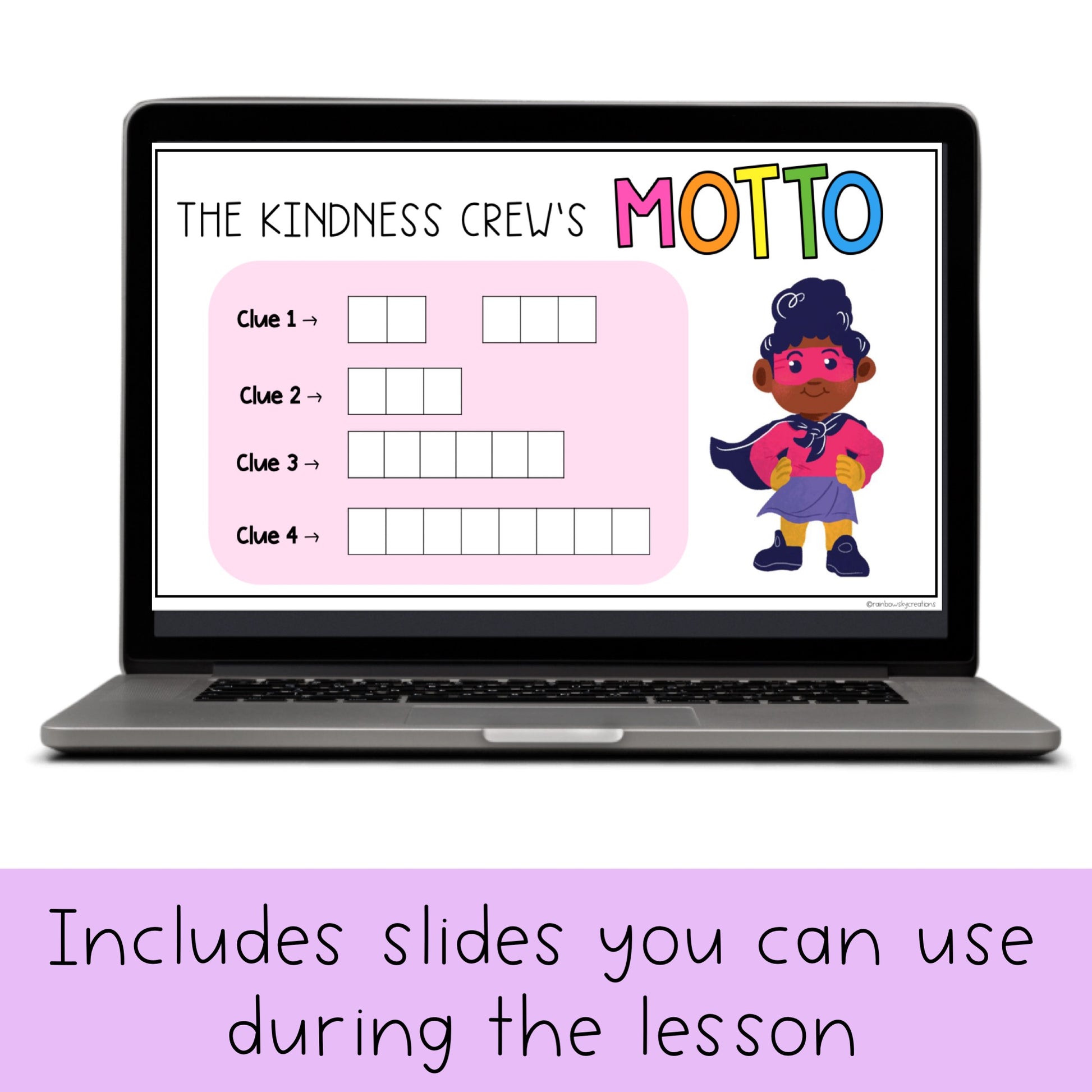 - Encourage collaboration and discussion as students decode each part of the Kindness Crew’s motto