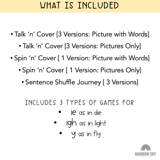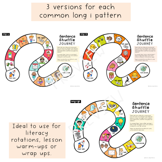 This pack includes three types of literacy games targeted for practising the long 'i' vowel word patterns. These literacy games can be used for lesson warm-ups, small groups, or fast finisher tasks - just to name a few suggestions.