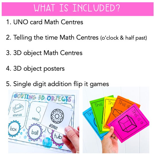 This BUNDLE includes all our hands-on and play math activity packs for Kindergarten (Prep / Foundation). It includes highly engaging, play-based, time-saving activities to teach your student's number sense, reading the time, simple addition and identifying features of 3D objects.