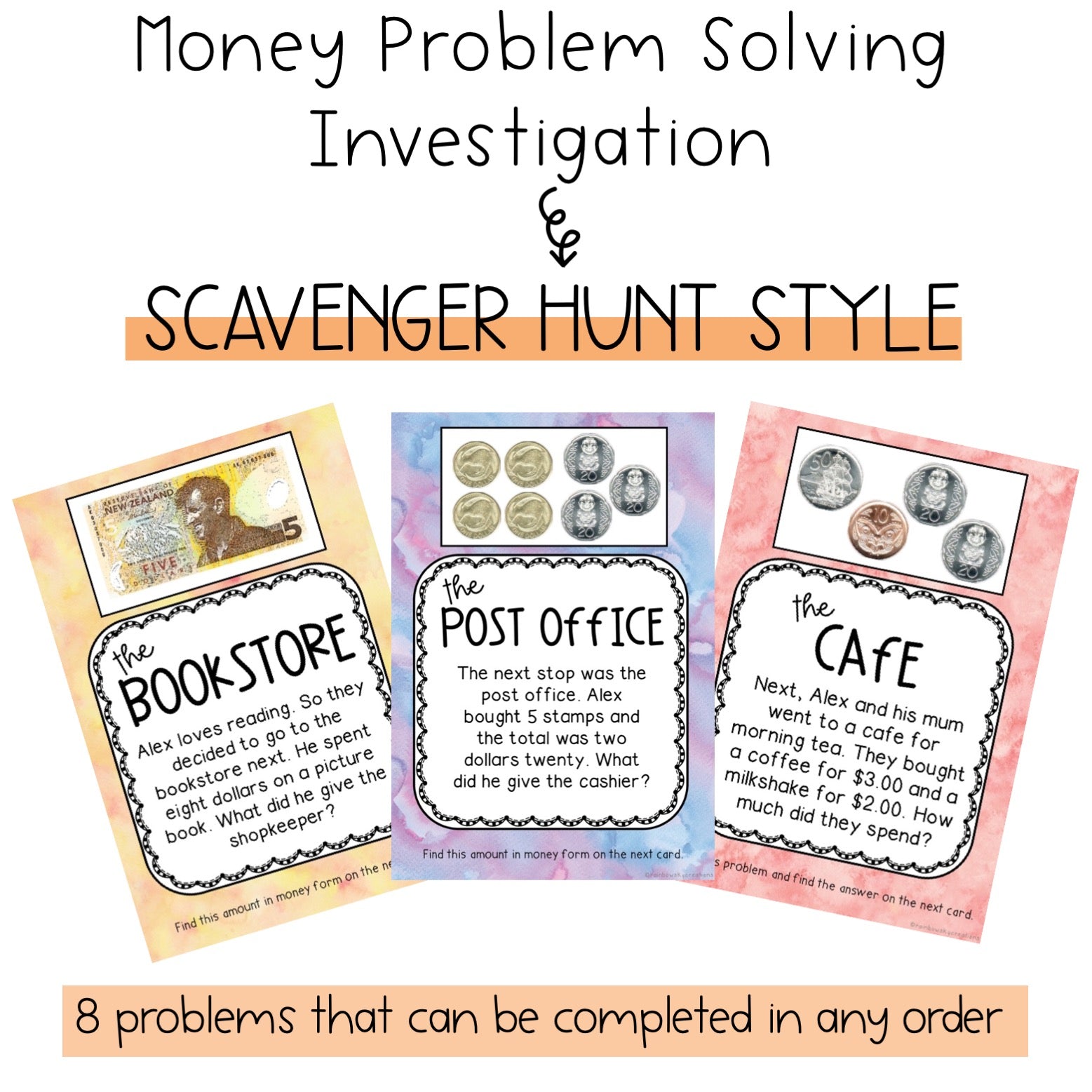 A scavenger hunt style activity to provide you and your students with a fun and interactive way to practice maths skills using New Zealand notes and coins. It is made up of 8 problems for students to solve.