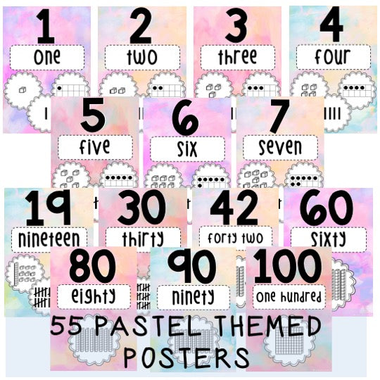 Brighten your classroom with these beautiful pastel number posters (includes number 1-50 and then decades to 100). Ideal to help you teach your students to read, record and understand our number system. They have been designed as the perfect visual to keep displayed in your classroom all year round to support your teaching and student’s learning.