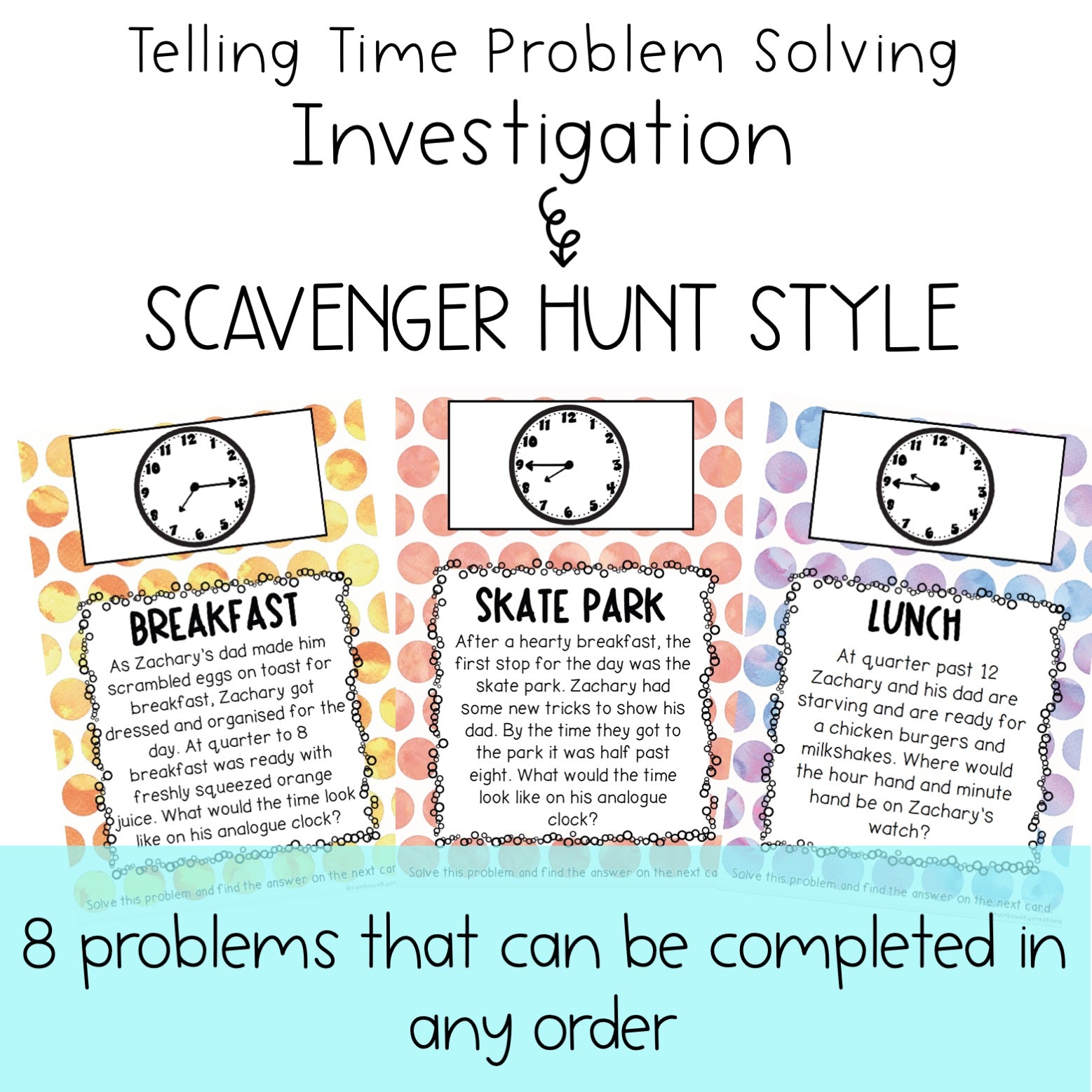 This is a super fun and interactive way to practice telling time to the half-hour and quarter-hour on an analog clock. This resource consists of 8 real-life problems for students to solve in a scavenger hunt-style setup around the classroom.