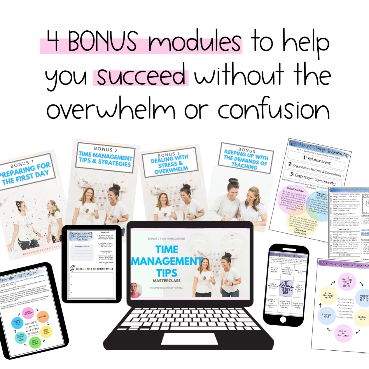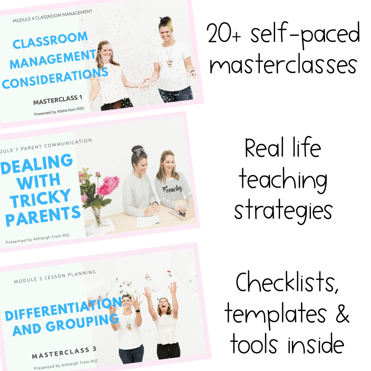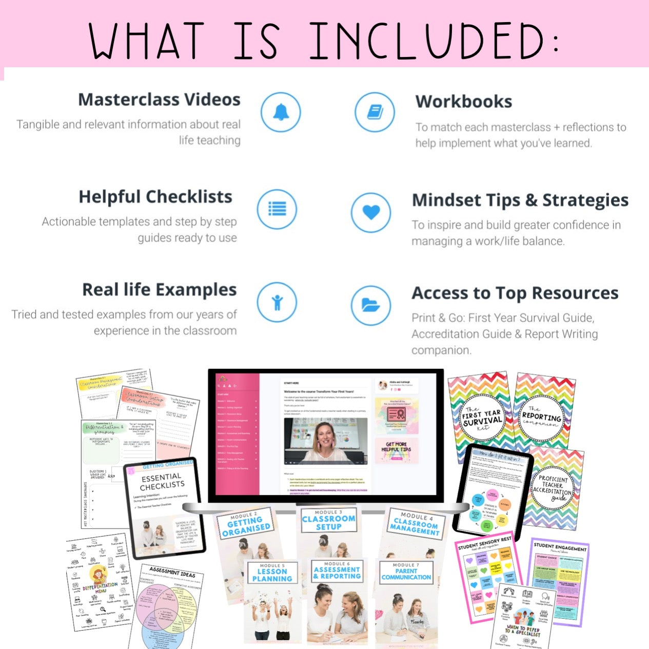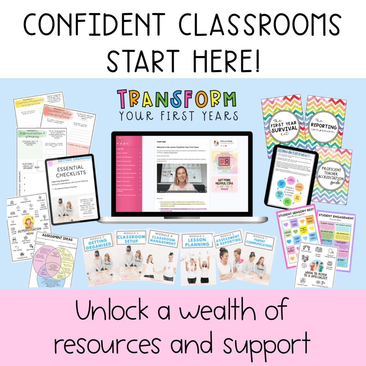 Developed by experienced educators, Ashleigh and Alisha. This course provides a roadmap to streamline your workload, enhance your teaching skills, and build a positive classroom environment. With lifetime access to over 20 masterclass videos and downloadable resources, you'll have the tools you need to thrive in your teaching career.