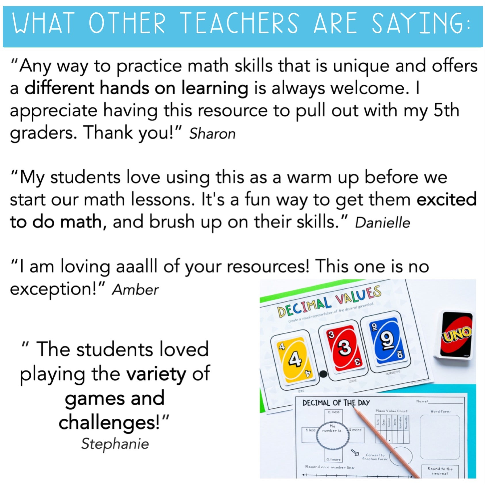 “Any way to practice math skills that is unique and offers a different hands-on learning is always welcome. I appreciate having this resource to pull out with my 5th graders. Thank you!” - Sharon